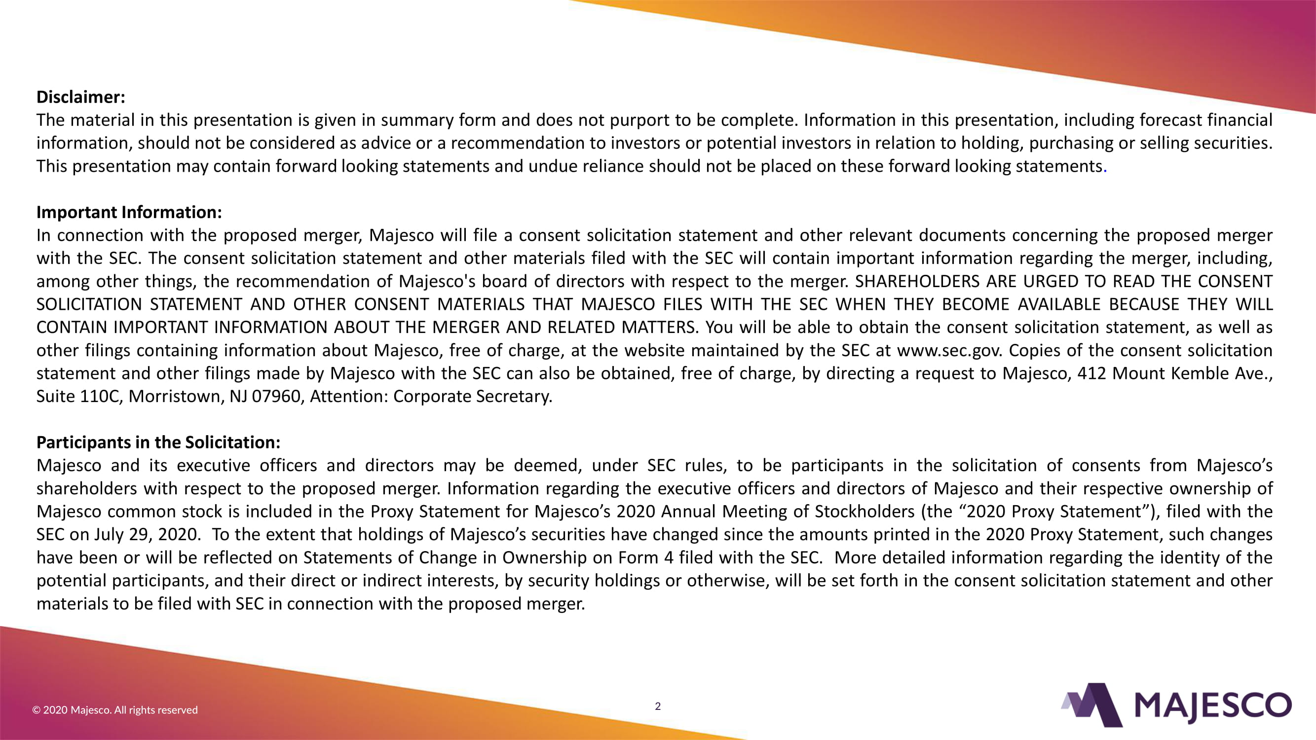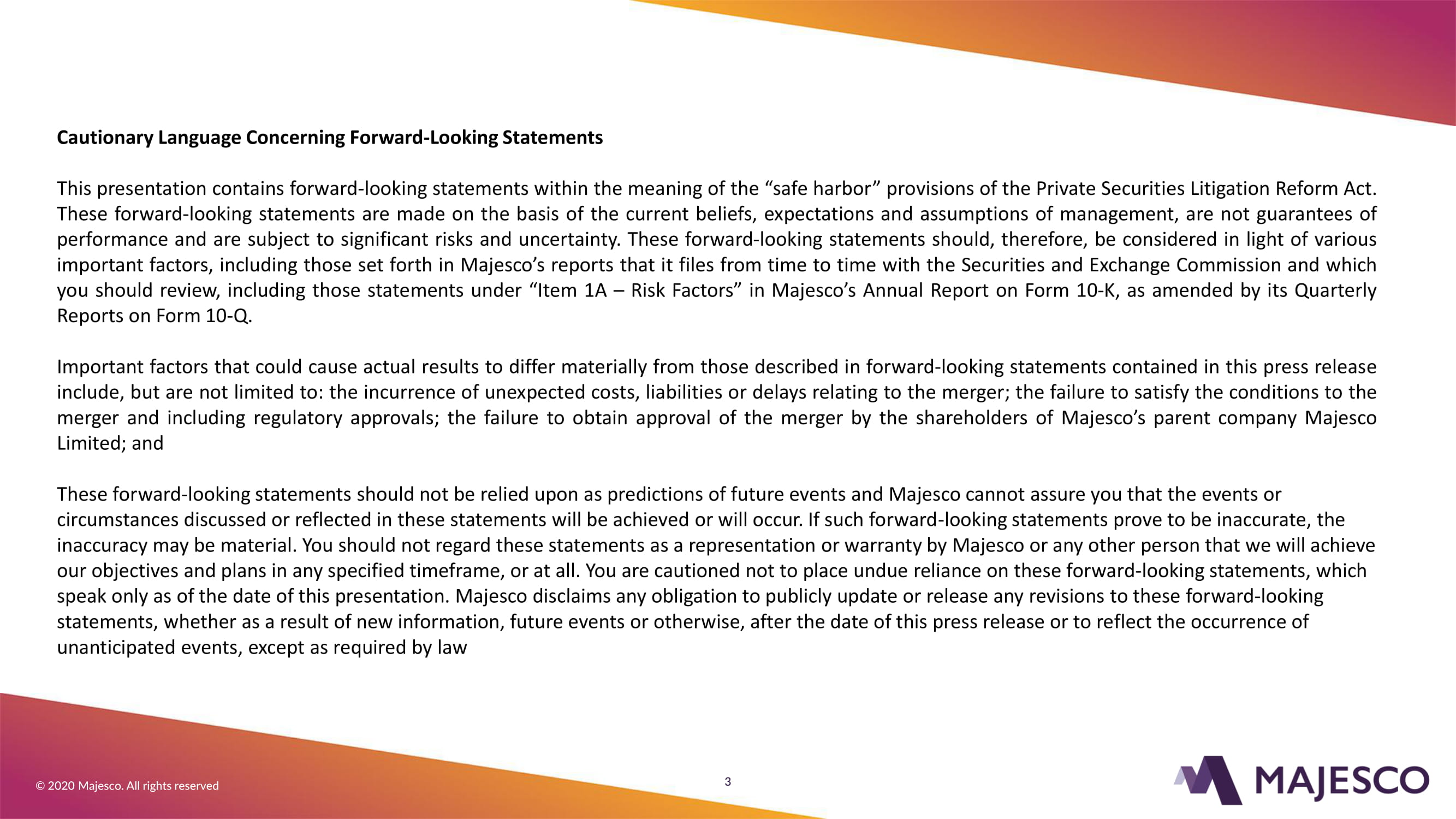 © 2020 Majesco. All rights reserved 2 Disclaimer : The material in this presentation is given in summary form and does not purport to be complete . Information in this presentation, including forecast financial information, should not be considered as advice or a recommendation to investors or potential investors in relation to holding, purchasing or selling securities . This presentation may contain forward looking statements and undue reliance should not be placed on these forward looking statements . Important Information : In connection with the proposed merger, Majesco will file a consent solicitation statement and other relevant documents concerning the proposed merger with the SEC . The consent solicitation statement and other materials filed with the SEC will contain important information regarding the merger, including, among other things, the recommendation of Majesco's board of directors with respect to the merger . SHAREHOLDERS ARE URGED TO READ THE CONSENT SOLICITATION STATEMENT AND OTHER CONSENT MATERIALS THAT MAJESCO FILES WITH THE SEC WHEN THEY BECOME AVAILABLE BECAUSE THEY WILL CONTAIN IMPORTANT INFORMATION ABOUT THE MERGER AND RELATED MATTERS . You will be able to obtain the consent solicitation statement, as well as other filings containing information about Majesco, free of charge, at the website maintained by the SEC at www . sec . gov . Copies of the consent solicitation statement and other filings made by Majesco with the SEC can also be obtained, free of charge, by directing a request to Majesco, 412 Mount Kemble Ave . , Suite 110 C, Morristown, NJ 07960 , Attention : Corporate Secretary . Participants in the Solicitation : Majesco and its executive officers and directors may be deemed, under SEC rules, to be participants in the solicitation of consents from Majesco’s shareholders with respect to the proposed merger . Information regarding the executive officers and directors of Majesco and their respective ownership of Majesco common stock is included in the Proxy Statement for Majesco’s 2020 Annual Meeting of Stockholders (the “ 2020 Proxy Statement”), filed with the SEC on July 29 , 2020 . To the extent that holdings of Majesco’s securities have changed since the amounts printed in the 2020 Proxy Statement, such changes have been or will be reflected on Statements of Change in Ownership on Form 4 filed with the SEC . More detailed information regarding the identity of the potential participants, and their direct or indirect interests, by security holdings or otherwise, will be set forth in the consent solicitation statement and other materials to be filed with SEC in connection with the proposed merger .