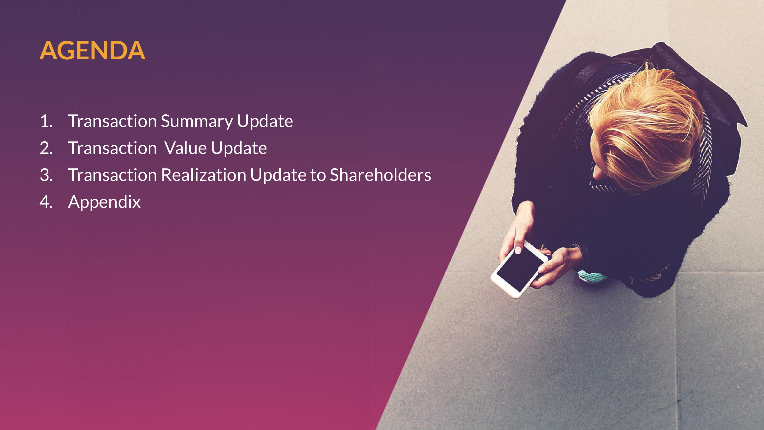 1. Transaction Summary Update 2. Transaction Value Update 3. Transaction Realization Update to Shareholders 4. Appendix AGENDA