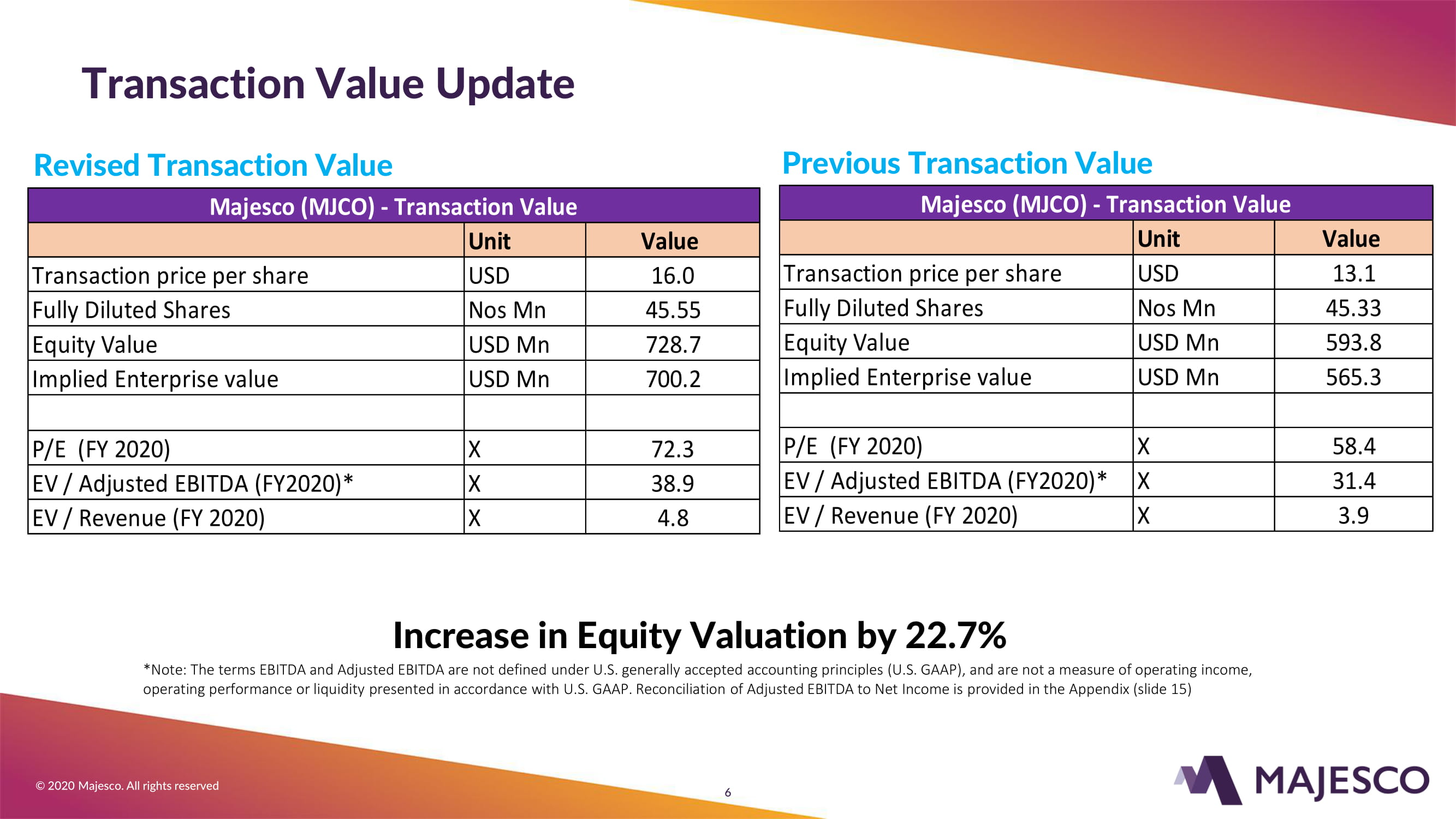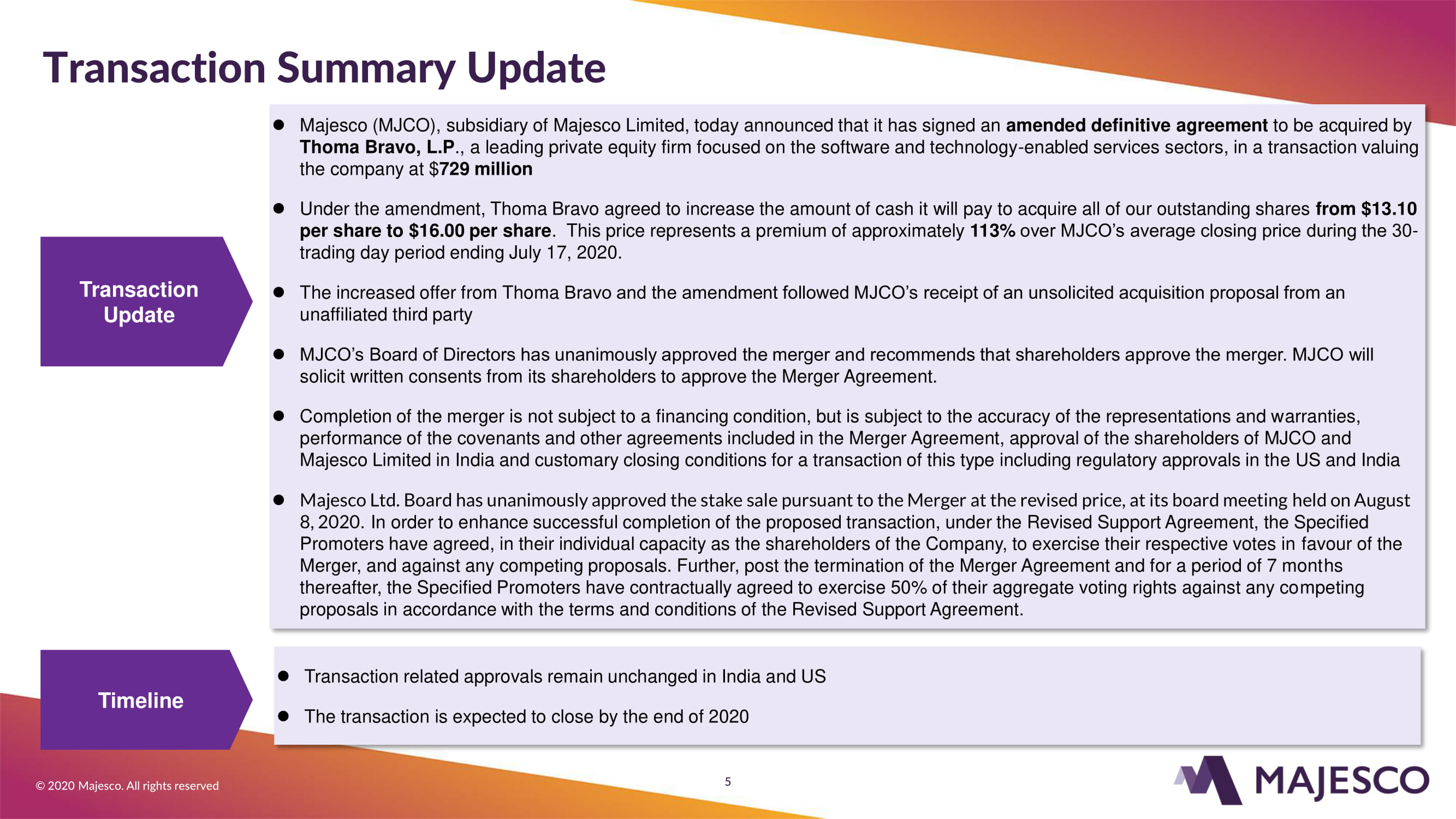 © 2020 Majesco. All rights reserved Transaction Summary Update 5 Transaction Update Majesco (MJCO), subsidiary of Majesco Limited, today announced that it has signed an amended definitive agreement to be acquired by Thoma Bravo, L.P ., a leading private equity firm focused on the software and technology - enabled services sectors, in a transaction valuing the company at $ 729 million Under the amendment, Thoma Bravo agreed to increase the amount of cash it will pay to acquire all of our outstanding shares from $13.10 per share to $16.00 per share . This price represents a premium of approximately 113% over MJCO’s average closing price during the 30 - trading day period ending July 17, 2020. The increased offer from Thoma Bravo and the amendment followed MJCO’s receipt of an unsolicited acquisition proposal from an unaffiliated third party MJCO’s Board of Directors has unanimously approved the merger and recommends that shareholders approve the merger. MJCO will solicit written consents from its shareholders to approve the Merger Agreement. Completion of the merger is not subject to a financing condition, but is subject to the accuracy of the representations and w arr anties, performance of the covenants and other agreements included in the Merger Agreement, approval of the shareholders of MJCO and Majesco Limited in India and customary closing conditions for a transaction of this type including regulatory approvals in th e U S and India Majesco Ltd. Board has unanimously approved the stake sale pursuant to the Merger at the revised price, at its board meeting hel d on August 8, 2020 . In order to enhance successful completion of the proposed transaction, under the Revised Support Agreement, the Specified Promoters have agreed, in their individual capacity as the shareholders of the Company, to exercise their respective votes in fa vour of the Merger, and against any competing proposals. Further, post the termination of the Merger Agreement and for a period of 7 mont hs thereafter, the Specified Promoters have contractually agreed to exercise 50% of their aggregate voting rights against any co mpe ting proposals in accordance with the terms and conditions of the Revised Support Agreement. Timeline Transaction related approvals remain unchanged in India and US The transaction is expected to close by the end of 2020