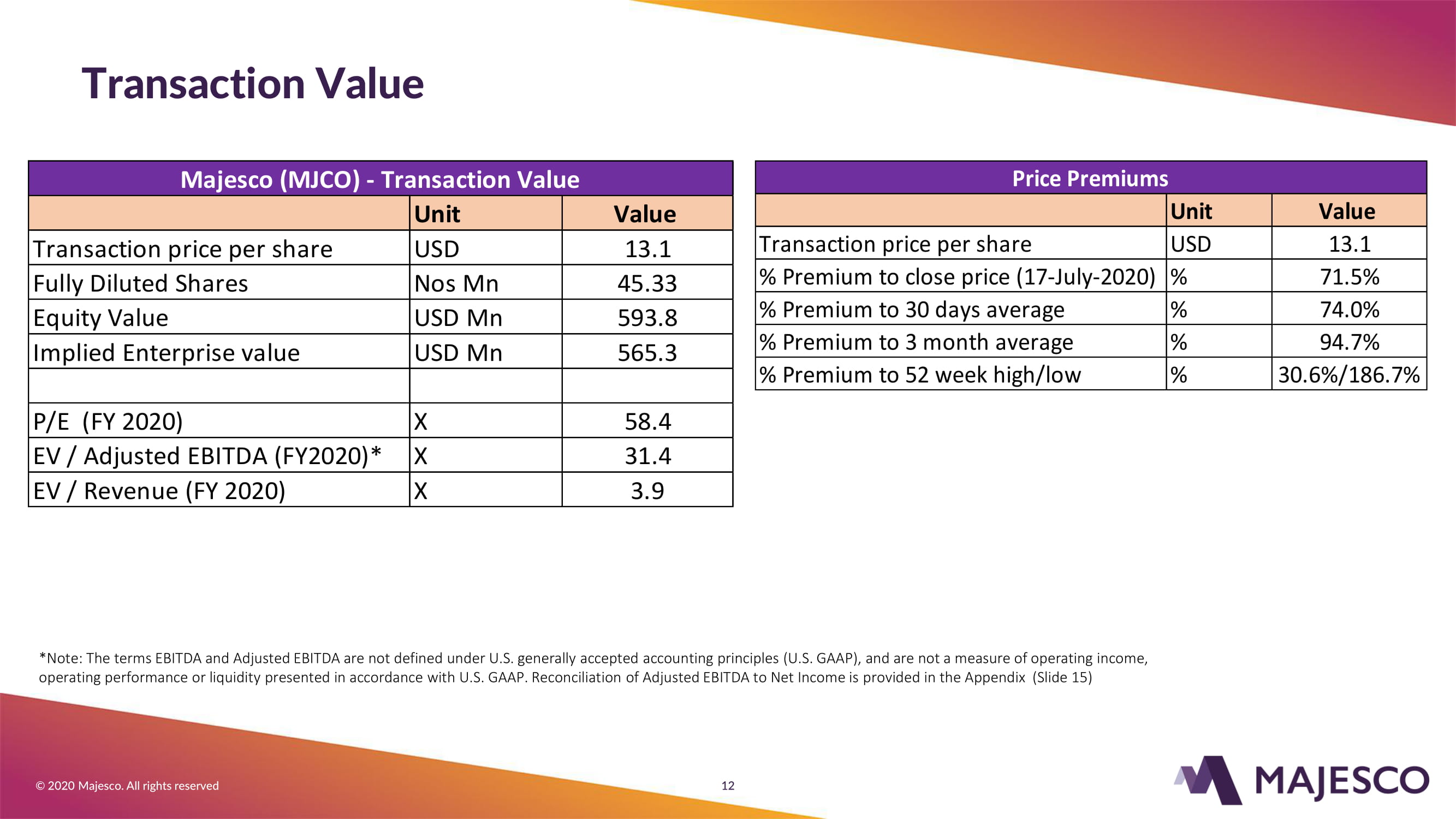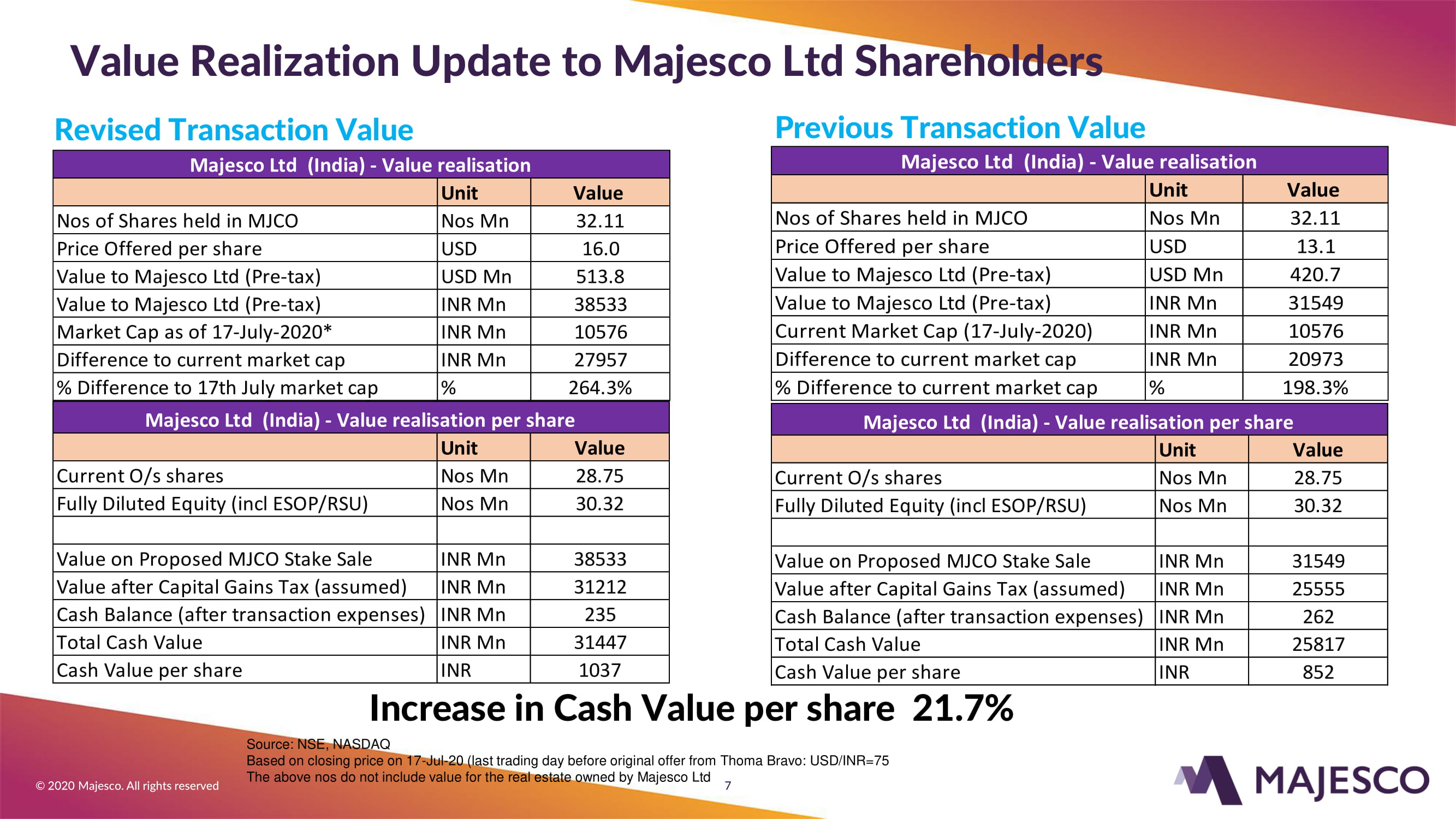 © 2020 Majesco. All rights reserved Value Realization Update to Majesco Ltd Shareholders Unit Value Nos of Shares held in MJCO Nos Mn 32.11 Price Offered per share USD 13.1 Value to Majesco Ltd (Pre-tax) USD Mn 420.7 Value to Majesco Ltd (Pre-tax) INR Mn 31549 Current Market Cap (17-July-2020) INR Mn 10576 Difference to current market cap INR Mn 20973 % Difference to current market cap % 198.3% Majesco Ltd (India) - Value realisation Source: NSE, NASDAQ Based on closing price on 17 - Jul - 20 (last trading day before original offer from Thoma Bravo: USD/INR=75 The above nos do not include value for the real estate owned by Majesco Ltd Previous Transaction Value Revised Transaction Value Unit Value Nos of Shares held in MJCO Nos Mn 32.11 Price Offered per share USD 16.0 Value to Majesco Ltd (Pre-tax) USD Mn 513.8 Value to Majesco Ltd (Pre-tax) INR Mn 38533 Market Cap as of 17-July-2020* INR Mn 10576 Difference to current market cap INR Mn 27957 % Difference to 17th July market cap % 264.3% Majesco Ltd (India) - Value realisation Unit Value Current O/s shares Nos Mn 28.75 Fully Diluted Equity (incl ESOP/RSU) Nos Mn 30.32 Value on Proposed MJCO Stake Sale INR Mn 38533 Value after Capital Gains Tax (assumed) INR Mn 31212 Cash Balance (after transaction expenses) INR Mn 235 Total Cash Value INR Mn 31447 Cash Value per share INR 1037 Majesco Ltd (India) - Value realisation per share Increase in Cash Value per share 21.7% Unit Value Current O/s shares Nos Mn 28.75 Fully Diluted Equity (incl ESOP/RSU) Nos Mn 30.32 Value on Proposed MJCO Stake Sale INR Mn 31549 Value after Capital Gains Tax (assumed) INR Mn 25555 Cash Balance (after transaction expenses) INR Mn 262 Total Cash Value INR Mn 25817 Cash Value per share INR 852 Majesco Ltd (India) - Value realisation per share 7