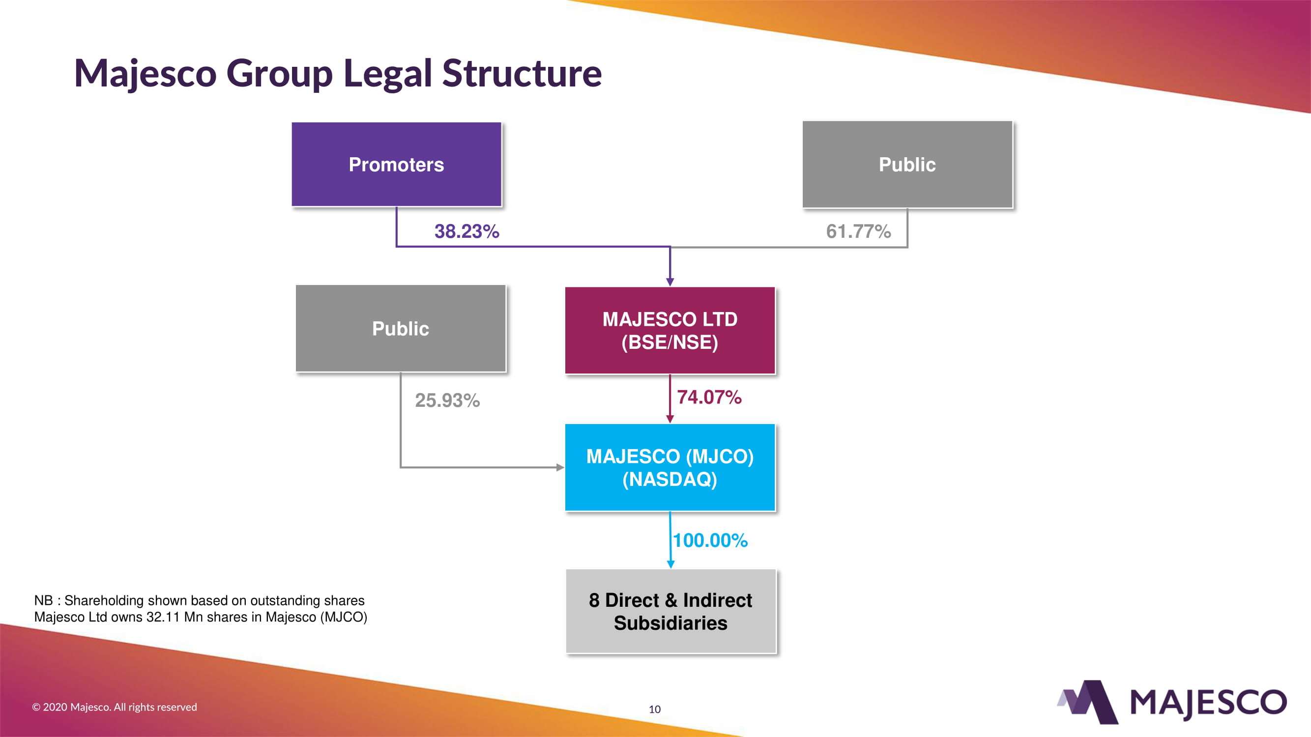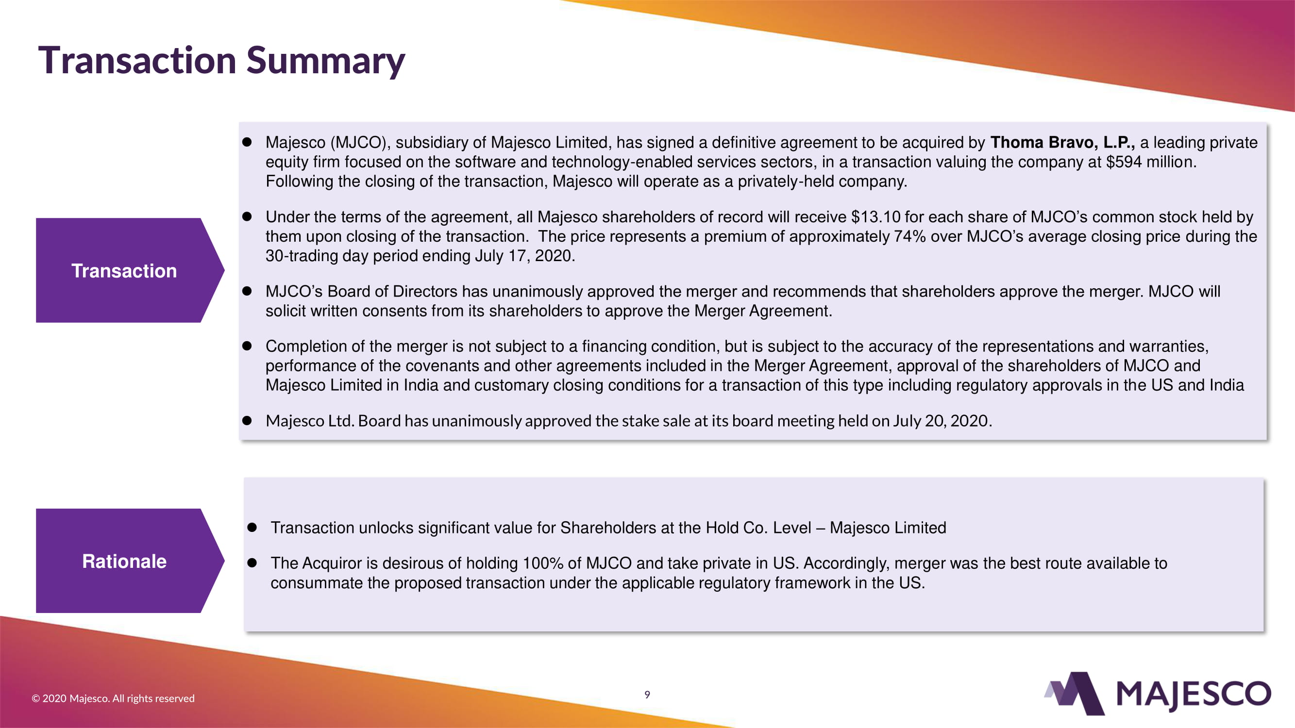 © 2020 Majesco. All rights reserved Transaction Summary 9 Transaction Majesco (MJCO), subsidiary of Majesco Limited, has signed a definitive agreement to be acquired by Thoma Bravo, L.P., a leading private equity firm focused on the software and technology - enabled services sectors, in a transaction valuing the company at $594 millio n. Following the closing of the transaction, Majesco will operate as a privately - held company. Under the terms of the agreement, all Majesco shareholders of record will receive $13.10 for each share of MJCO’s common stoc k h eld by them upon closing of the transaction. The price represents a premium of approximately 74% over MJCO’s average closing price dur ing the 30 - trading day period ending July 17, 2020. MJCO’s Board of Directors has unanimously approved the merger and recommends that shareholders approve the merger. MJCO will solicit written consents from its shareholders to approve the Merger Agreement. Completion of the merger is not subject to a financing condition, but is subject to the accuracy of the representations and w arr anties, performance of the covenants and other agreements included in the Merger Agreement, approval of the shareholders of MJCO and Majesco Limited in India and customary closing conditions for a transaction of this type including regulatory approvals in th e U S and India Majesco Ltd. Board has unanimously approved the stake sale at its board meeting held on July 20, 2020 . Rationale Transaction unlocks significant value for Shareholders at the Hold Co. Level – Majesco Limited The Acquiror is desirous of holding 100% of MJCO and take private in US. Accordingly, merger was the best route available to consummate the proposed transaction under the applicable regulatory framework in the US.