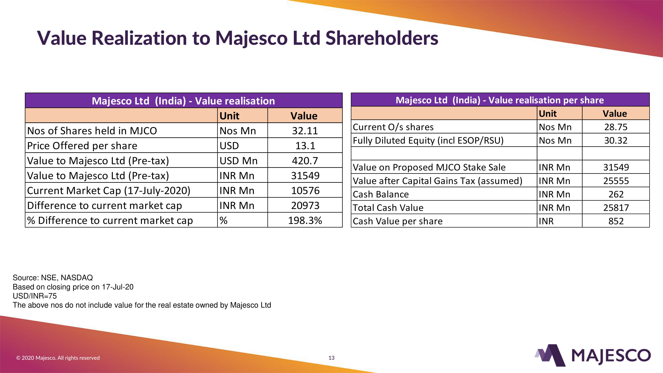 © 2020 Majesco. All rights reserved Value Realization to Majesco Ltd Shareholders Unit Value Nos of Shares held in MJCO Nos Mn 32.11 Price Offered per share USD 13.1 Value to Majesco Ltd (Pre-tax) USD Mn 420.7 Value to Majesco Ltd (Pre-tax) INR Mn 31549 Current Market Cap (17-July-2020) INR Mn 10576 Difference to current market cap INR Mn 20973 % Difference to current market cap % 198.3% Majesco Ltd (India) - Value realisation Source: NSE, NASDAQ Based on closing price on 17 - Jul - 20 USD/INR=75 The above nos do not include value for the real estate owned by Majesco Ltd Unit Value Current O/s shares Nos Mn 28.75 Fully Diluted Equity (incl ESOP/RSU) Nos Mn 30.32 Value on Proposed MJCO Stake Sale INR Mn 31549 Value after Capital Gains Tax (assumed) INR Mn 25555 Cash Balance INR Mn 262 Total Cash Value INR Mn 25817 Cash Value per share INR 852 Majesco Ltd (India) - Value realisation per share 13