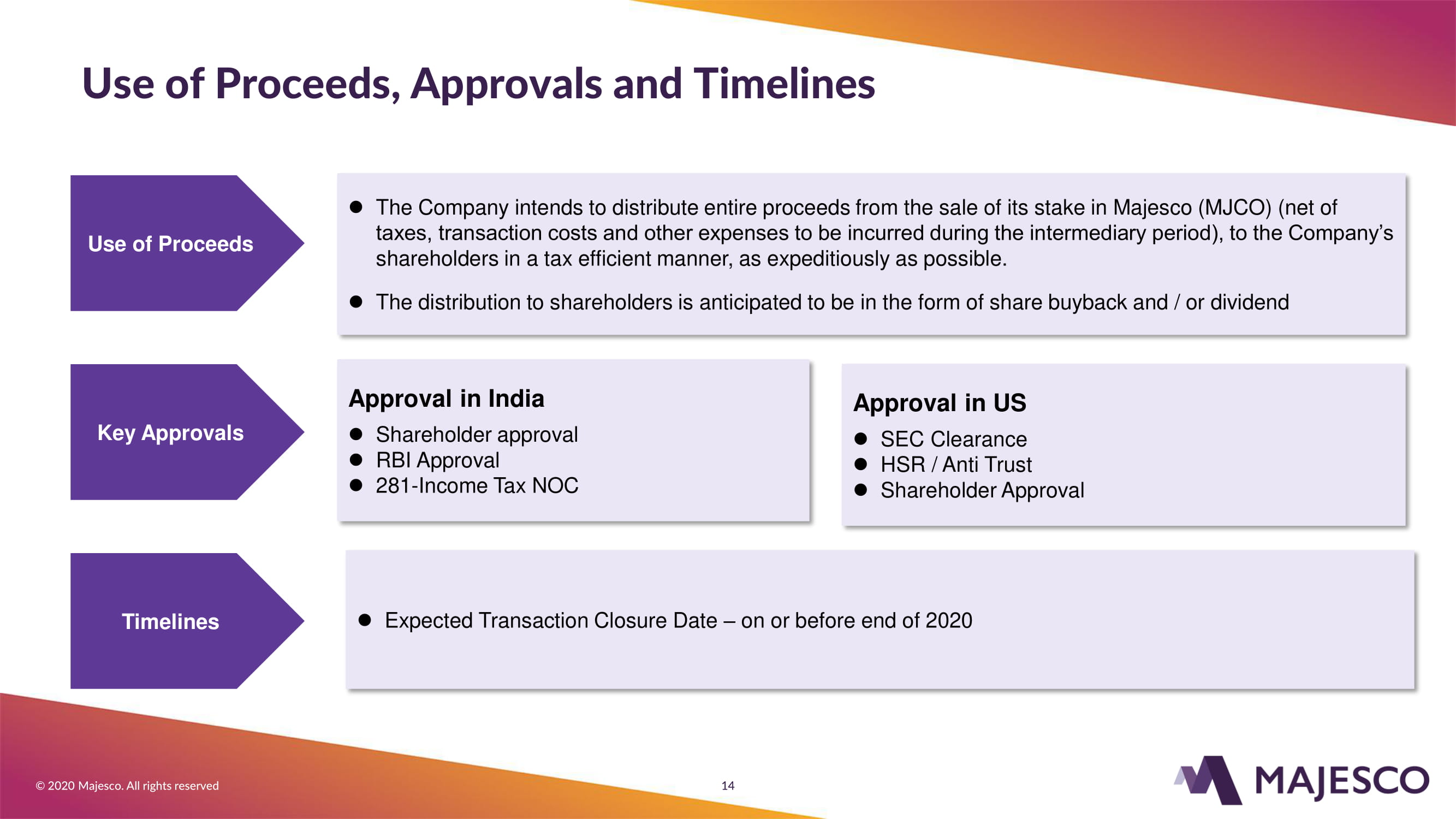 © 2020 Majesco. All rights reserved Use of Proceeds, Approvals and Timelines Use of Proceeds Key Approvals The Company intends to distribute entire proceeds from the sale of its stake in Majesco (MJCO) (net of taxes, transaction costs and other expenses to be incurred during the intermediary period), to the Company’s shareholders in a tax efficient manner, as expeditiously as possible. The distribution to shareholders is anticipated to be in the form of share buyback and / or dividend Timelines Expected Transaction Closure Date – on or before end of 2020 Approval in India Shareholder approval RBI Approval 281 - Income Tax NOC Approval in US SEC Clearance HSR / Anti Trust Shareholder Approval 14