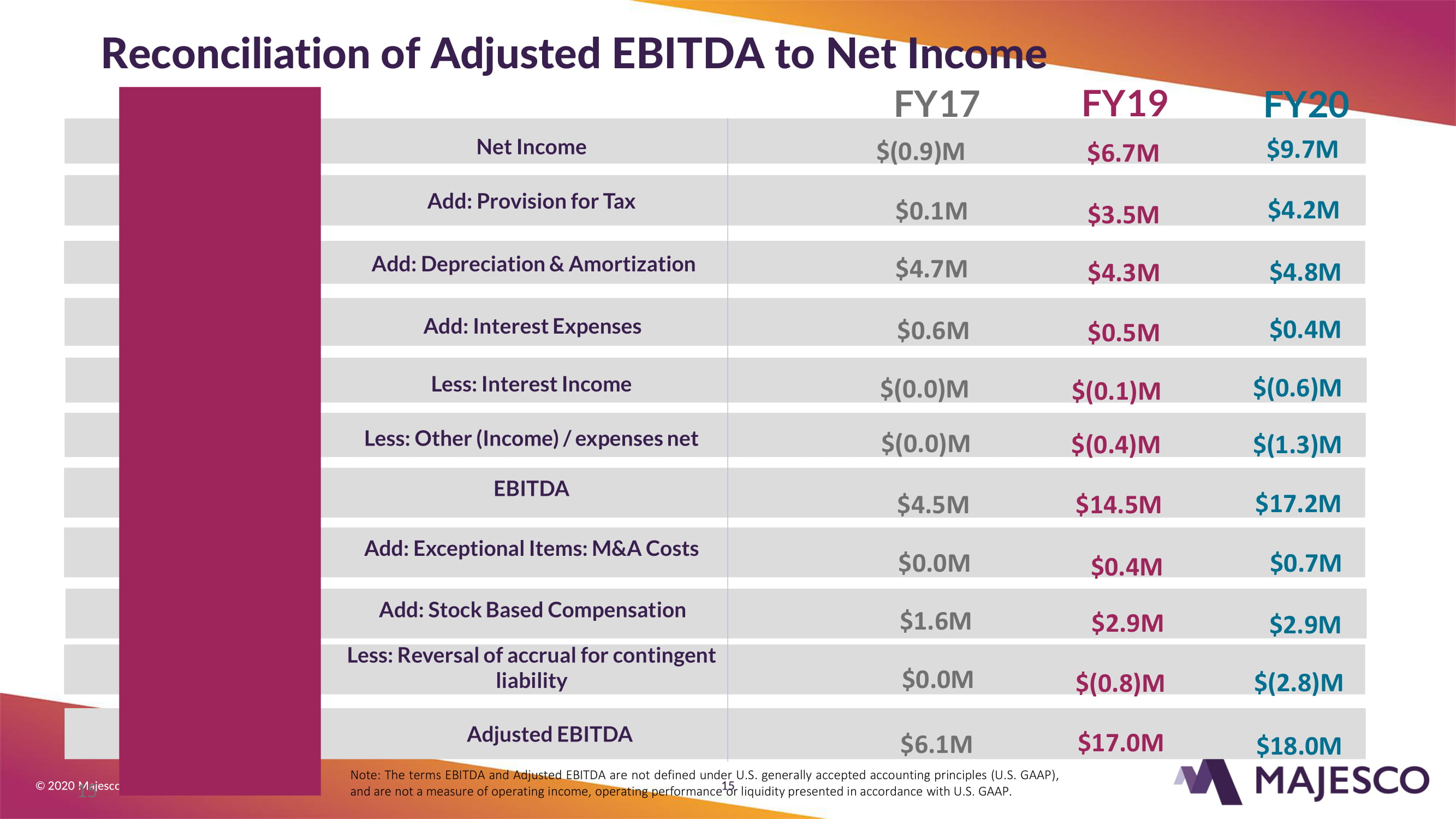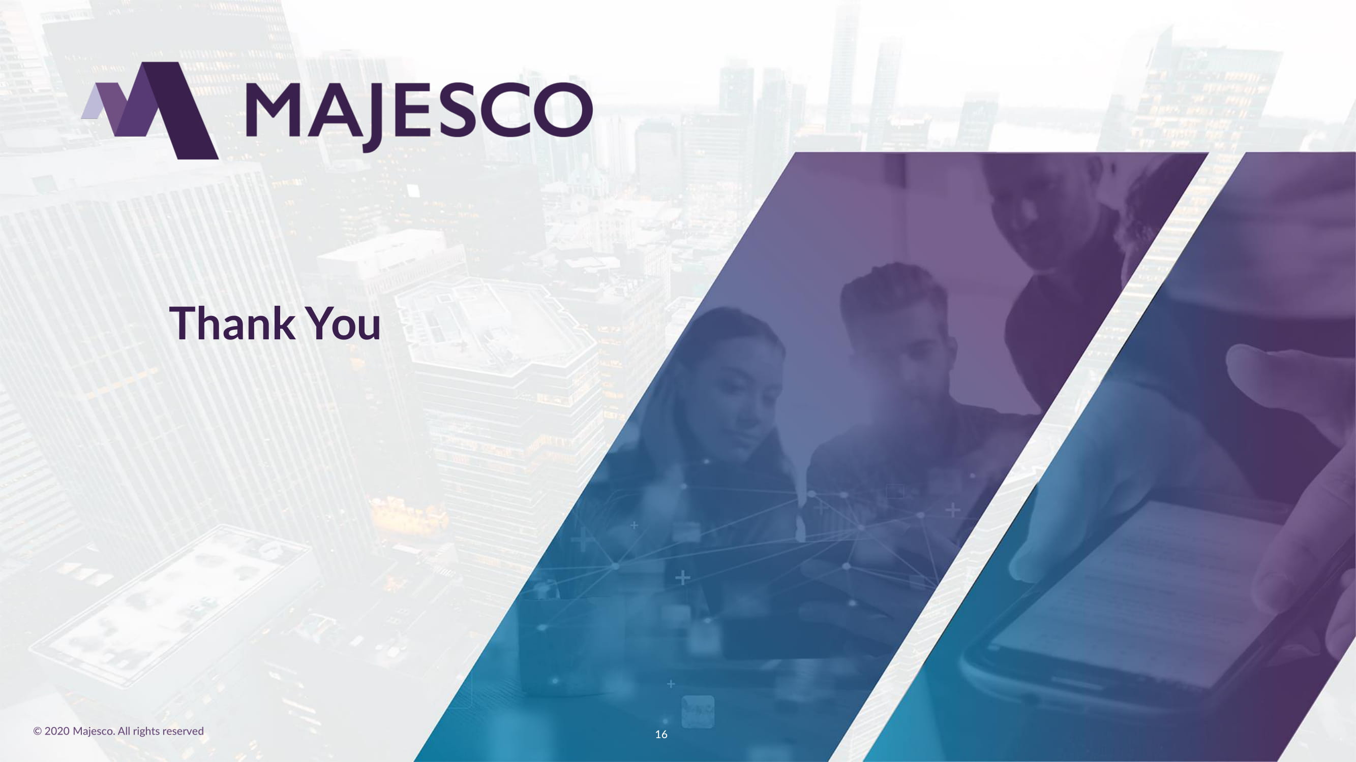 © 2020 Majesco. All rights reserved Reconciliation of Adjusted EBITDA to Net Income NET CASH/ (DEBT) TION FY19 NET CASH POSITION 15 FY20 Add: Exceptional Items: M&A Costs $0.4M $0.0M $0.7M Add: Stock Based Compensation $2.9M $1.6M $2.9M Less: Reversal of accrual for contingent liability $(0.8)M $0.0M $(2.8)M Net Income Add: Provision for Tax Add: Depreciation & Amortization Add: Interest Expenses Less: Interest Income Less: Other (Income) / expenses net EBITDA $14.5M $(0.9)M $0.1M $3.5M $4.7M $0.6M $(0.0)M $(0.0)M $4.5M $6.1M $4.3M $0.5M $(0.1)M $(0.4)M $6.7M $17.0M $9.7M $4.2M $4.8M $(1.3)M $17.2M $18.0M Note : The terms EBITDA and Adjusted EBITDA are not defined under U . S . generally accepted accounting principles (U . S . GAAP), and are not a measure of operating income, operating performance or liquidity presented in accordance with U . S . GAAP . FY17 Adjusted EBITDA $0.4M $(0.6)M 15