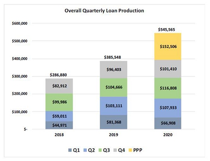 Total balance sheet loans at December 31, 2020 were $1.08 billion, which is inclusive of $105.49 million of PPP loans, compared to December 31, 2019 balances of $1.06 billion. Total loans under management reside at $1.33 billion, which includes $204.55 million of service retained loans. Driven by strong consumer mortgage activity, overall traditional loan production (non-PPP) for 2020 was $393.06 million, compared to $385.55 million for the same period of 2019. When including PPP loans, total production was $545.57 million. Of the total production, commercial loans equated to $128 million, consumer $265 million and the aforementioned $152 million of PPP. Within the consumer totals was $205 million of secondary market mortgage production compared to $89 million for 2019.