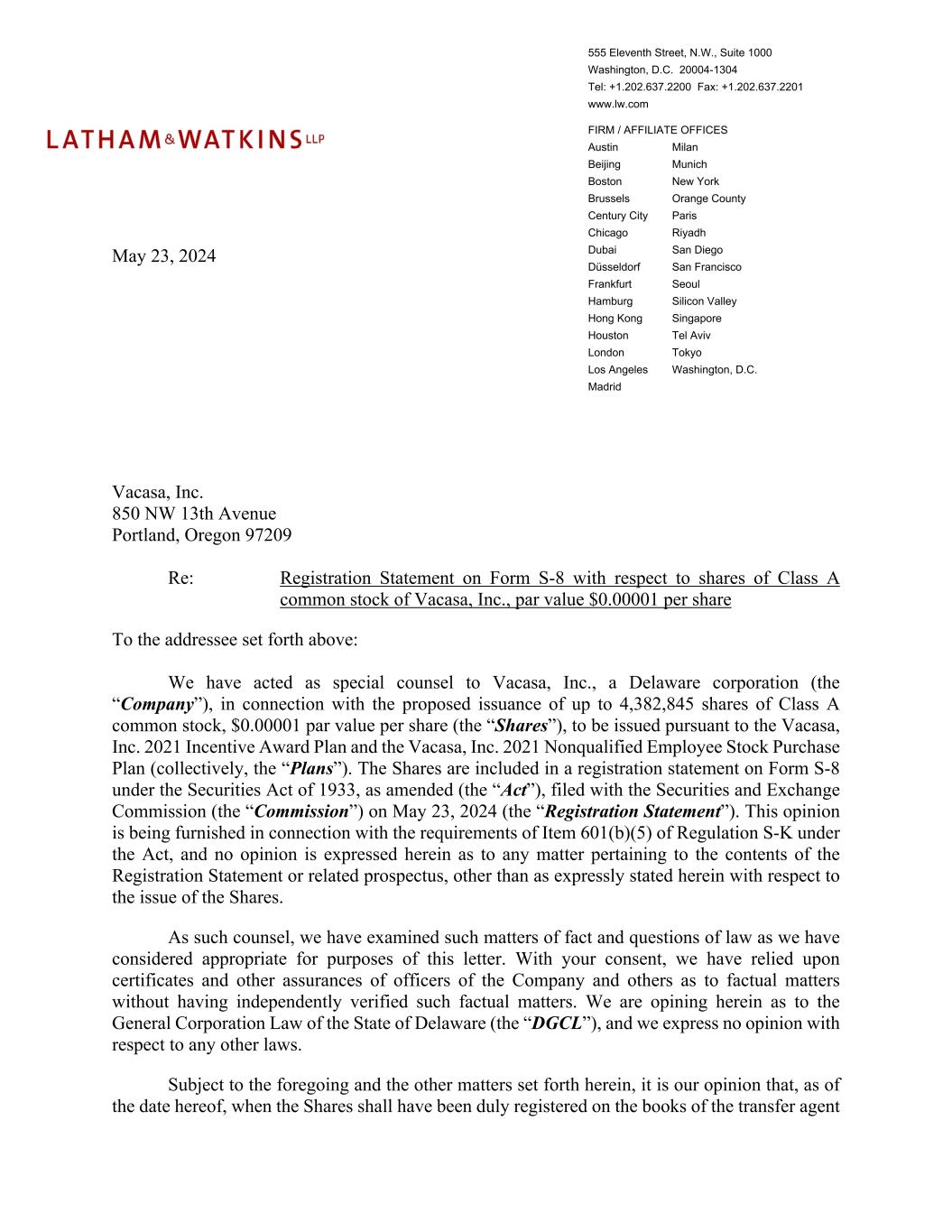 555 Eleventh Street, N.W., Suite 1000 Washington, D.C. 20004-1304 Tel: +1.202.637.2200 Fax: +1.202.637.2201 www.lw.com FIRM / AFFILIATE OFFICES Austin Milan Beijing Munich Boston New York Brussels Orange County Century City Paris Chicago Riyadh Dubai San Diego Düsseldorf San Francisco Frankfurt Seoul Hamburg Silicon Valley Hong Kong Singapore Houston Tel Aviv London Tokyo Los Angeles Washington, D.C. Madrid May 23, 2024 Vacasa, Inc. 850 NW 13th Avenue Portland, Oregon 97209 Re: Registration Statement on Form S-8 with respect to shares of Class A common stock of Vacasa, Inc., par value $0.00001 per share To the addressee set forth above: We have acted as special counsel to Vacasa, Inc., a Delaware corporation (the “Company”), in connection with the proposed issuance of up to 4,382,845 shares of Class A common stock, $0.00001 par value per share (the “Shares”), to be issued pursuant to the Vacasa, Inc. 2021 Incentive Award Plan and the Vacasa, Inc. 2021 Nonqualified Employee Stock Purchase Plan (collectively, the “Plans”). The Shares are included in a registration statement on Form S-8 under the Securities Act of 1933, as amended (the “Act”), filed with the Securities and Exchange Commission (the “Commission”) on May 23, 2024 (the “Registration Statement”). This opinion is being furnished in connection with the requirements of Item 601(b)(5) of Regulation S-K under the Act, and no opinion is expressed herein as to any matter pertaining to the contents of the Registration Statement or related prospectus, other than as expressly stated herein with respect to the issue of the Shares. As such counsel, we have examined such matters of fact and questions of law as we have considered appropriate for purposes of this letter. With your consent, we have relied upon certificates and other assurances of officers of the Company and others as to factual matters without having independently verified such factual matters. We are opining herein as to the General Corporation Law of the State of Delaware (the “DGCL”), and we express no opinion with respect to any other laws. Subject to the foregoing and the other matters set forth herein, it is our opinion that, as of the date hereof, when the Shares shall have been duly registered on the books of the transfer agent