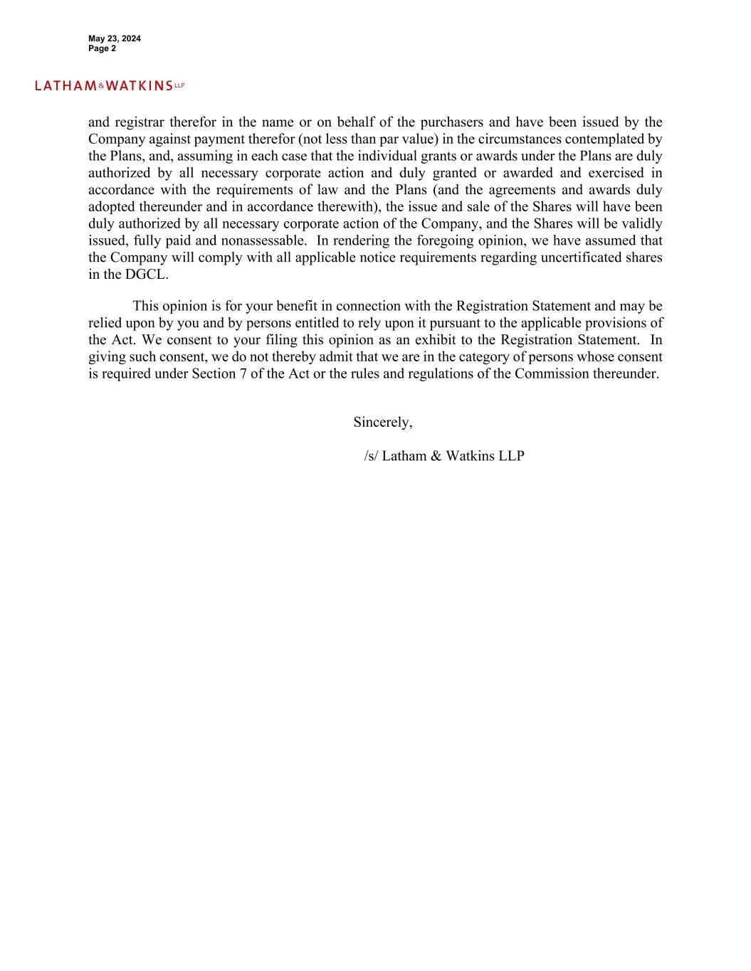 May 23, 2024 Page 2 and registrar therefor in the name or on behalf of the purchasers and have been issued by the Company against payment therefor (not less than par value) in the circumstances contemplated by the Plans, and, assuming in each case that the individual grants or awards under the Plans are duly authorized by all necessary corporate action and duly granted or awarded and exercised in accordance with the requirements of law and the Plans (and the agreements and awards duly adopted thereunder and in accordance therewith), the issue and sale of the Shares will have been duly authorized by all necessary corporate action of the Company, and the Shares will be validly issued, fully paid and nonassessable. In rendering the foregoing opinion, we have assumed that the Company will comply with all applicable notice requirements regarding uncertificated shares in the DGCL. This opinion is for your benefit in connection with the Registration Statement and may be relied upon by you and by persons entitled to rely upon it pursuant to the applicable provisions of the Act. We consent to your filing this opinion as an exhibit to the Registration Statement. In giving such consent, we do not thereby admit that we are in the category of persons whose consent is required under Section 7 of the Act or the rules and regulations of the Commission thereunder. Sincerely, /s/ Latham & Watkins LLP