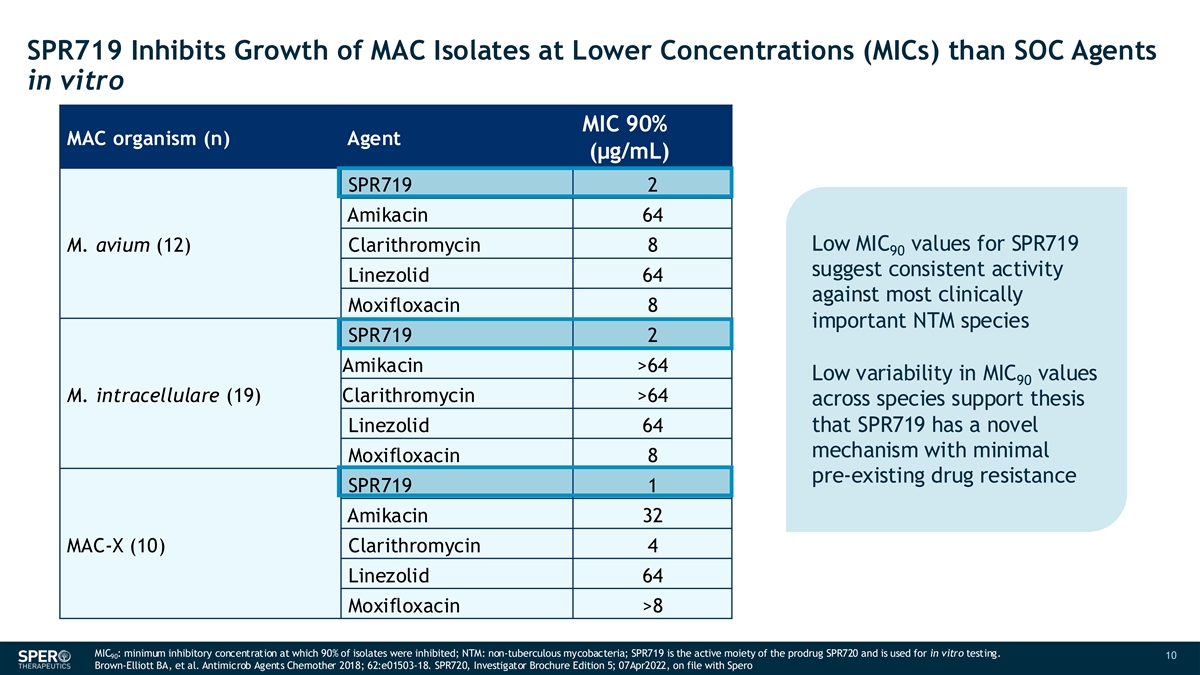 SPR720's Novel Mechanism of Action Not Exploited by Existing Antibiotics for NTM-PD SPR720/719 targets DNA gyrase (GyrB subunit), Azithromycin (AZM) disrupts ribosomal Ethambutol (EMB) disrupts 1 2 3 a critical enzyme for DNA replication and RNA activity; AZM blocks passage of growing Arabinogalactan formation, a critical 1 transcription peptide & RNA through ribosome cell wall component Arabinosyl DNA replication DNA gyrase transferase Peptide Ribosome mRNA transcription AZM ethambutol SPR720/719 Arabinose Arabinogalactan Cell wall production DNA replication Translation 1 2 3 and integrity and transcription mRNA Ribosomes Arabinogalactan Critical component of mycobacterial cell walls Novel target and differentiated MOA potentially position SPR720 to improve current SOC regimen 1. Winthrop KL, et al. Expert Rev Anti Infect Ther 2023; 21:1177-87. 9