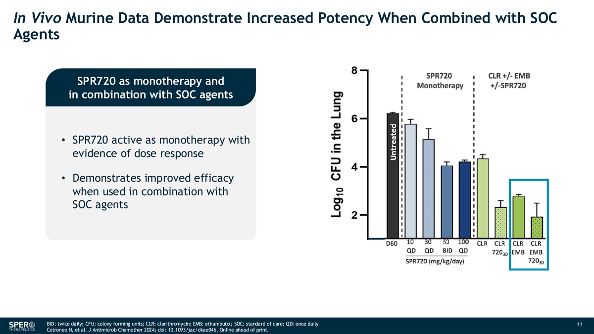 In Vivo Murine Data Demonstrate Increased Potency When Combined with SOC Agents SPR720 as monotherapy and in combination with SOC agents • SPR720 active as monotherapy with evidence of dose response • Demonstrates improved efficacy when used in combination with SOC agents BID: twice daily; CFU: colony forming units; CLR: clarithromycin; EMB: ethambutol; SOC: standard of care; QD: once daily 11 Cotroneo N, et al. J Antimicrob Chemother 2024; doi: 10.1093/jac/dkae046. Online ahead of print.