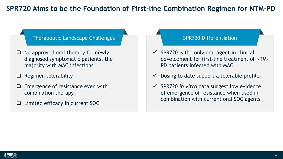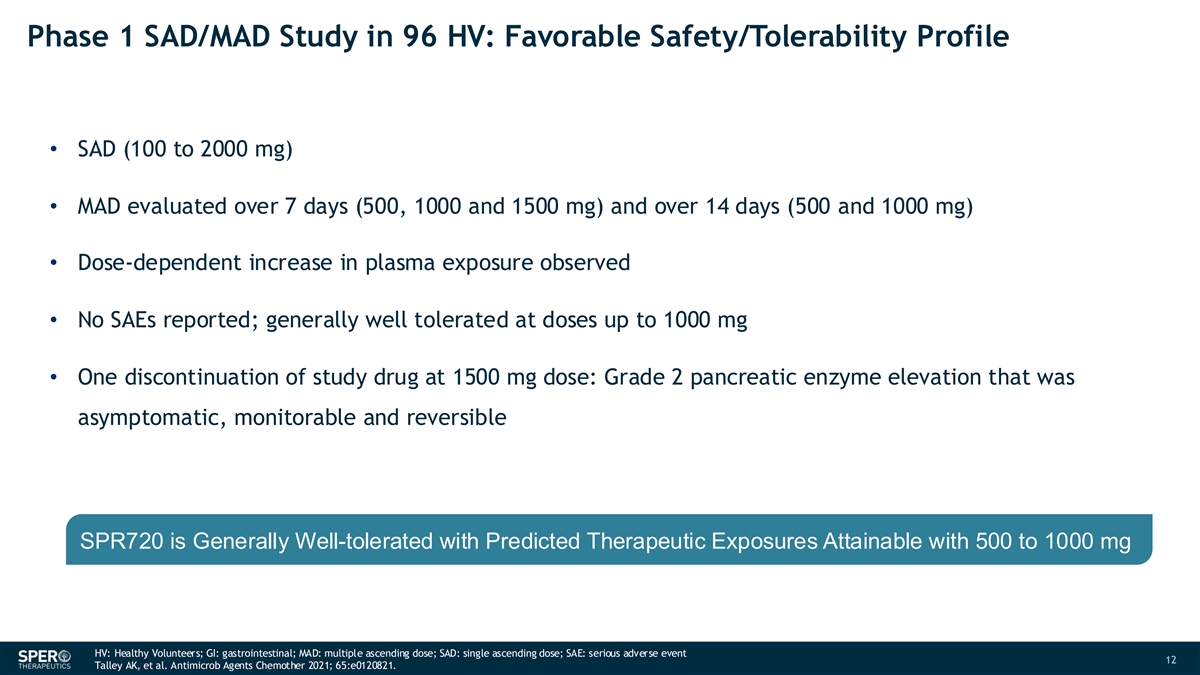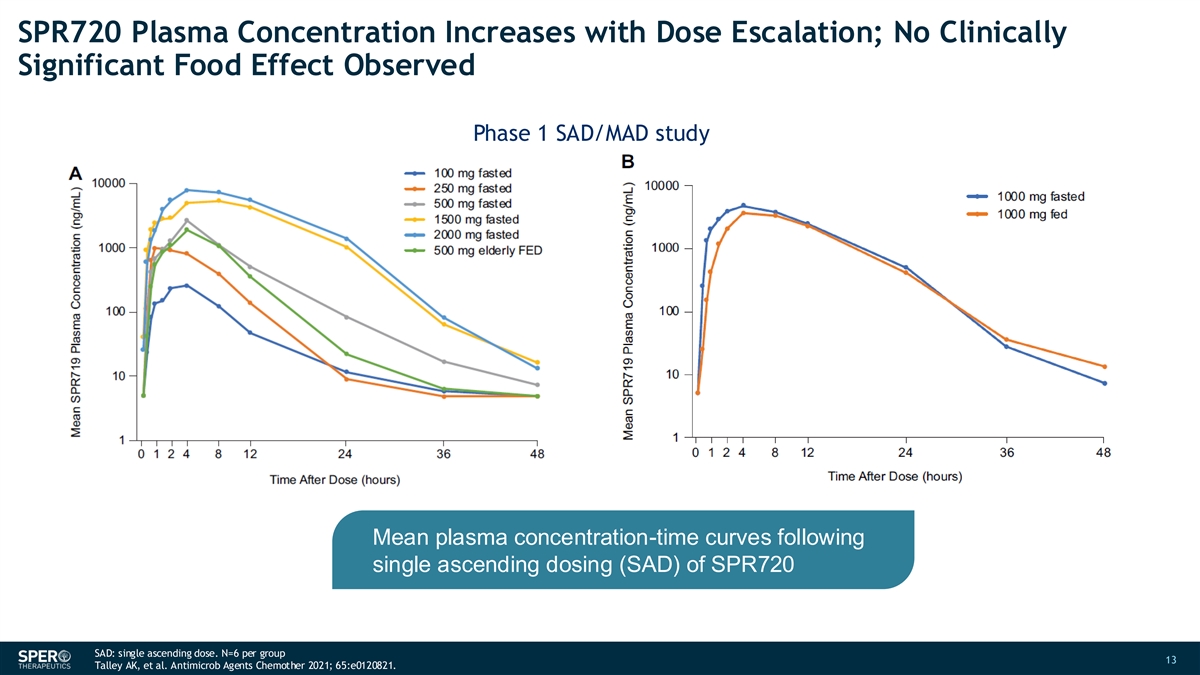 Phase 1 SAD/MAD Study in 96 HV: Favorable Safety/Tolerability Profile • SAD (100 to 2000 mg) • MAD evaluated over 7 days (500, 1000 and 1500 mg) and over 14 days (500 and 1000 mg) • Dose-dependent increase in plasma exposure observed • No SAEs reported; generally well tolerated at doses up to 1000 mg • One discontinuation of study drug at 1500 mg dose: Grade 2 pancreatic enzyme elevation that was asymptomatic, monitorable and reversible SPR720 is Generally Well-tolerated with Predicted Therapeutic Exposures Attainable with 500 to 1000 mg HV: Healthy Volunteers; GI: gastrointestinal; MAD: multiple ascending dose; SAD: single ascending dose; SAE: serious adverse event 12 Talley AK, et al. Antimicrob Agents Chemother 2021; 65:e0120821.