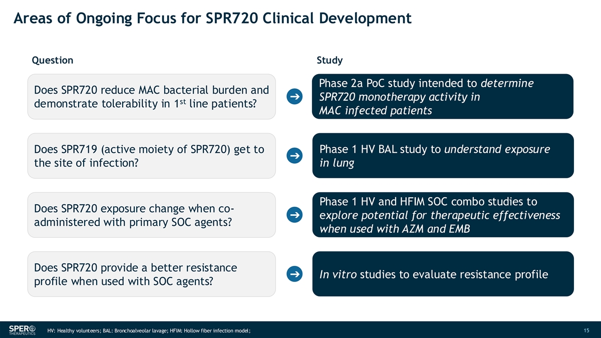 SPR720 Aims to be the Foundation of First-line Combination Regimen for NTM-PD Therapeutic Landscape Challenges SPR720 Differentiation ❑ No approved oral therapy for newly ✓ SPR720 is the only oral agent in clinical diagnosed symptomatic patients, the development for first-line treatment of NTM- majority with MAC infections PD patients infected with MAC ❑ Regimen tolerability✓ Dosing to date support a tolerable profile ❑ Emergence of resistance even with ✓ SPR720 in vitro data suggest low evidence combination therapy of emergence of resistance when used in combination with current oral SOC agents ❑ Limited efficacy in current SOC 14