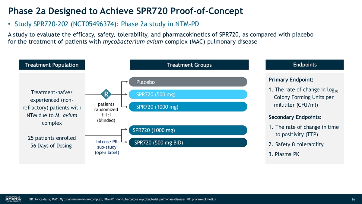 Areas of Ongoing Focus for SPR720 Clinical Development Question Study Phase 2a PoC study intended to determine Does SPR720 reduce MAC bacterial burden and ➔ SPR720 monotherapy activity in st demonstrate tolerability in 1 line patients? MAC infected patients Does SPR719 (active moiety of SPR720) get to Phase 1 HV BAL study to understand exposure ➔ the site of infection? in lung Phase 1 HV and HFIM SOC combo studies to Does SPR720 exposure change when co- ➔ explore potential for therapeutic effectiveness administered with primary SOC agents? when used with AZM and EMB Does SPR720 provide a better resistance ➔ In vitro studies to evaluate resistance profile profile when used with SOC agents? HV: Healthy volunteers; BAL: Bronchoalveolar lavage; HFIM: Hollow fiber infection model; 15