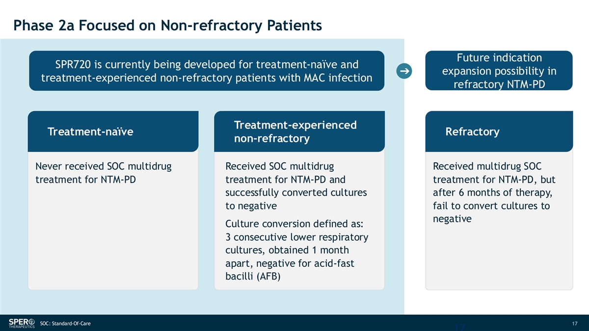 Phase 2a Designed to Achieve SPR720 Proof-of-Concept • Study SPR720-202 (NCT05496374): Phase 2a study in NTM-PD A study to evaluate the efficacy, safety, tolerability, and pharmacokinetics of SPR720, as compared with placebo for the treatment of patients with mycobacterium avium complex (MAC) pulmonary disease Endpoints Treatment Population Treatment Groups Primary Endpoint: Placebo 1. The rate of change in log 10 Treatment-naïve/ SPR720 (500 mg) R Colony Forming Units per experienced (non- patients milliliter (CFU/ml) SPR720 (1000 mg) refractory) patients with randomized 1:1:1 NTM due to M. avium Secondary Endpoints: (blinded) complex 1. The rate of change in time SPR720 (1000 mg) to positivity (TTP) 25 patients enrolled Intense PK SPR720 (500 mg BID) 2. Safety & tolerability 56 Days of Dosing sub-study (open label) 3. Plasma PK BID: twice daily; MAC: Mycobacterium avium complex; NTM-PD: non-tuberculous mycobacterial pulmonary disease; PK: pharmacokinetics 16