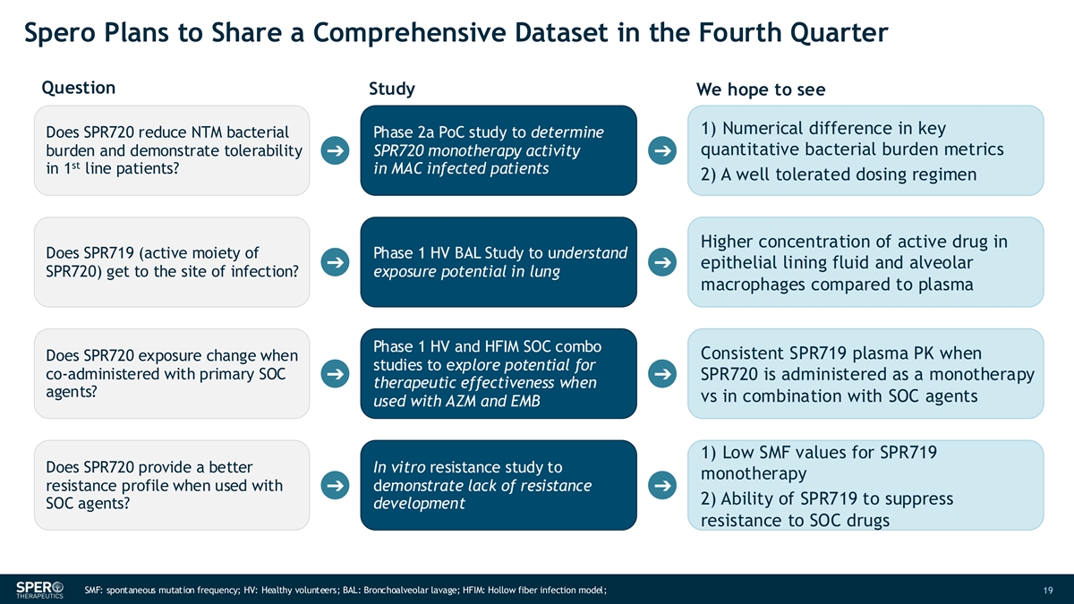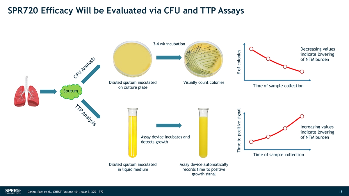 SPR720 Efficacy Will be Evaluated via CFU and TTP Assays 3-4 wk incubation Decreasing values indicate lowering of NTM burden Diluted sputum inoculated Visually count colonies Time of sample collection on culture plate Sputum Increasing values indicate lowering Assay device incubates and of NTM burden detects growth Time of sample collection Diluted sputum inoculated Assay device automatically in liquid medium records time to positive growth signal 18 Danho, Rabi et al., CHEST, Volume 161, Issue 2, 370 - 372 Time to positive signal # of colonies