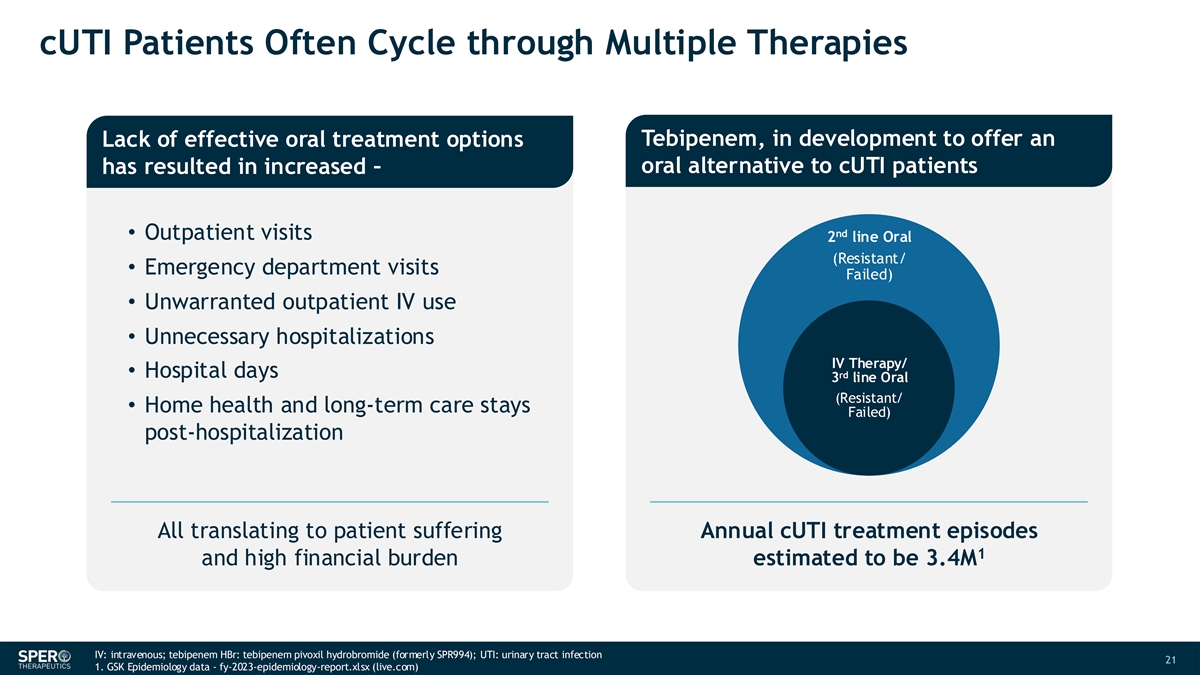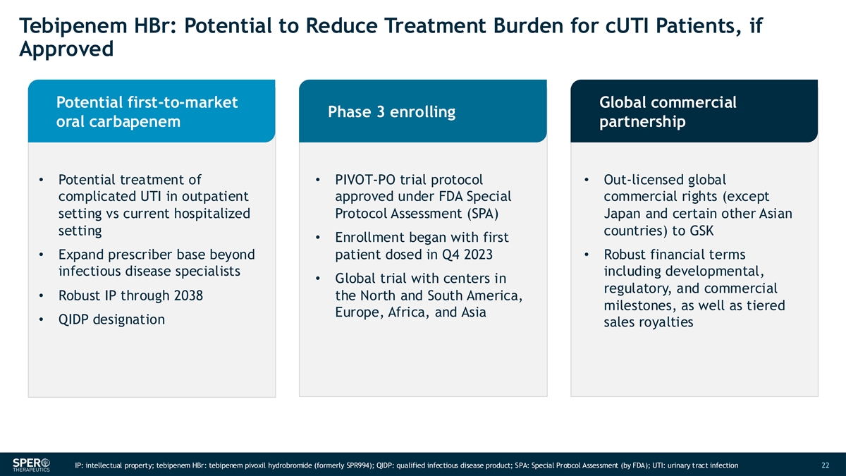 cUTI Patients Often Cycle through Multiple Therapies Tebipenem, in development to offer an Lack of effective oral treatment options has resulted in increased – oral alternative to cUTI patients nd • Outpatient visits 2 line Oral (Resistant/ • Emergency department visits Failed) • Unwarranted outpatient IV use • Unnecessary hospitalizations IV Therapy/ • Hospital days rd 3 line Oral (Resistant/ • Home health and long-term care stays Failed) post-hospitalization All translating to patient suffering Annual cUTI treatment episodes 1 and high financial burden estimated to be 3.4M IV: intravenous; tebipenem HBr: tebipenem pivoxil hydrobromide (formerly SPR994); UTI: urinary tract infection 21 1. GSK Epidemiology data - fy-2023-epidemiology-report.xlsx (live.com)