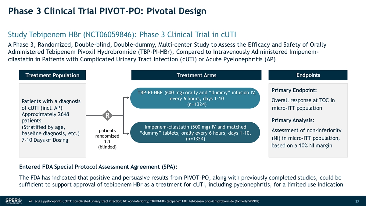 Tebipenem HBr: Potential to Reduce Treatment Burden for cUTI Patients, if Approved Potential first-to-market Global commercial Phase 3 enrolling oral carbapenem partnership • Potential treatment of • PIVOT-PO trial protocol • Out-licensed global complicated UTI in outpatient approved under FDA Special commercial rights (except setting vs current hospitalized Protocol Assessment (SPA) Japan and certain other Asian setting countries) to GSK • Enrollment began with first • Expand prescriber base beyond patient dosed in Q4 2023• Robust financial terms infectious disease specialists including developmental, • Global trial with centers in regulatory, and commercial • Robust IP through 2038 the North and South America, milestones, as well as tiered Europe, Africa, and Asia • QIDP designation sales royalties IP: intellectual property; tebipenem HBr: tebipenem pivoxil hydrobromide (formerly SPR994); QIDP: qualified infectious disease product; SPA: Special Prot ocol Assessment (by FDA); UTI: urinary tract infection 22