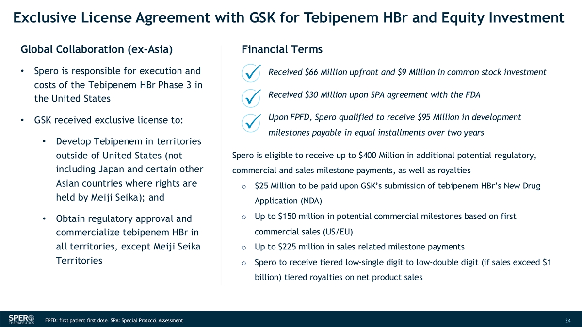 Exclusive License Agreement with GSK for Tebipenem HBr and Equity Investment Global Collaboration (ex-Asia) Financial Terms • Spero is responsible for execution and Received $66 Million upfront and $9 Million in common stock investment costs of the Tebipenem HBr Phase 3 in Received $30 Million upon SPA agreement with the FDA the United States Upon FPFD, Spero qualified to receive $95 Million in development • GSK received exclusive license to: milestones payable in equal installments over two years • Develop Tebipenem in territories Spero is eligible to receive up to $400 Million in additional potential regulatory, outside of United States (not including Japan and certain other commercial and sales milestone payments, as well as royalties Asian countries where rights are o $25 Million to be paid upon GSK’s submission of tebipenem HBr’s New Drug held by Meiji Seika); and Application (NDA) o Up to $150 million in potential commercial milestones based on first • Obtain regulatory approval and commercial sales (US/EU) commercialize tebipenem HBr in all territories, except Meiji Seika o Up to $225 million in sales related milestone payments Territories o Spero to receive tiered low-single digit to low-double digit (if sales exceed $1 billion) tiered royalties on net product sales FPFD: first patient first dose. SPA: Special Protocol Assessment 24