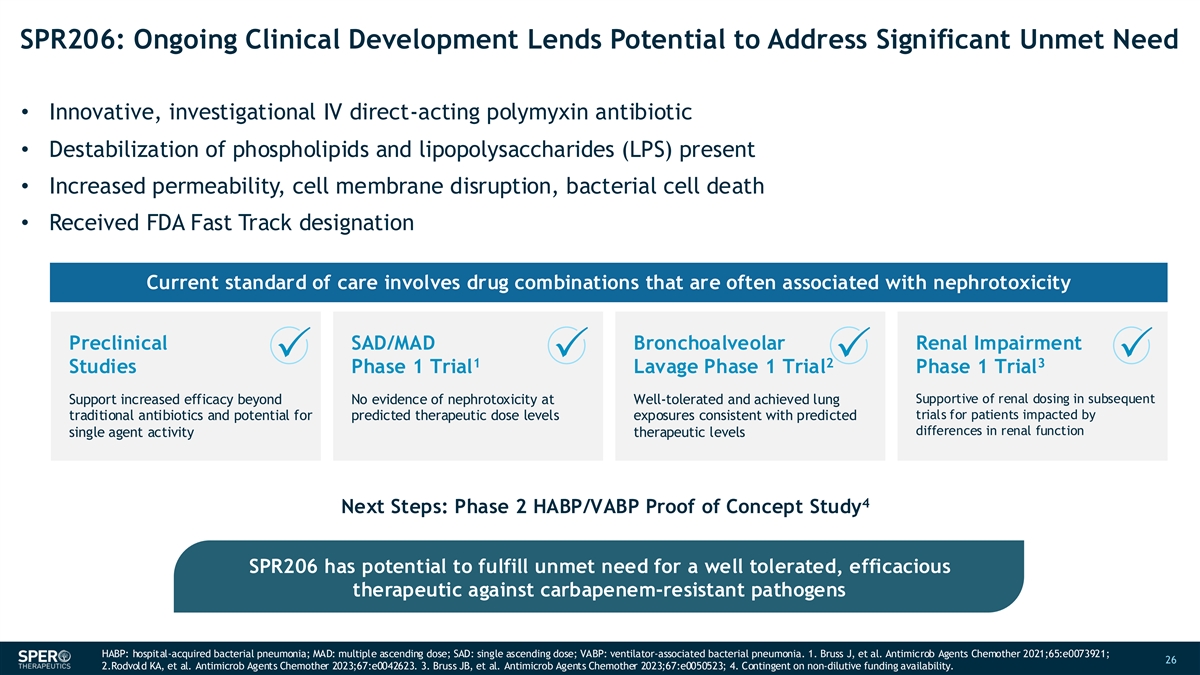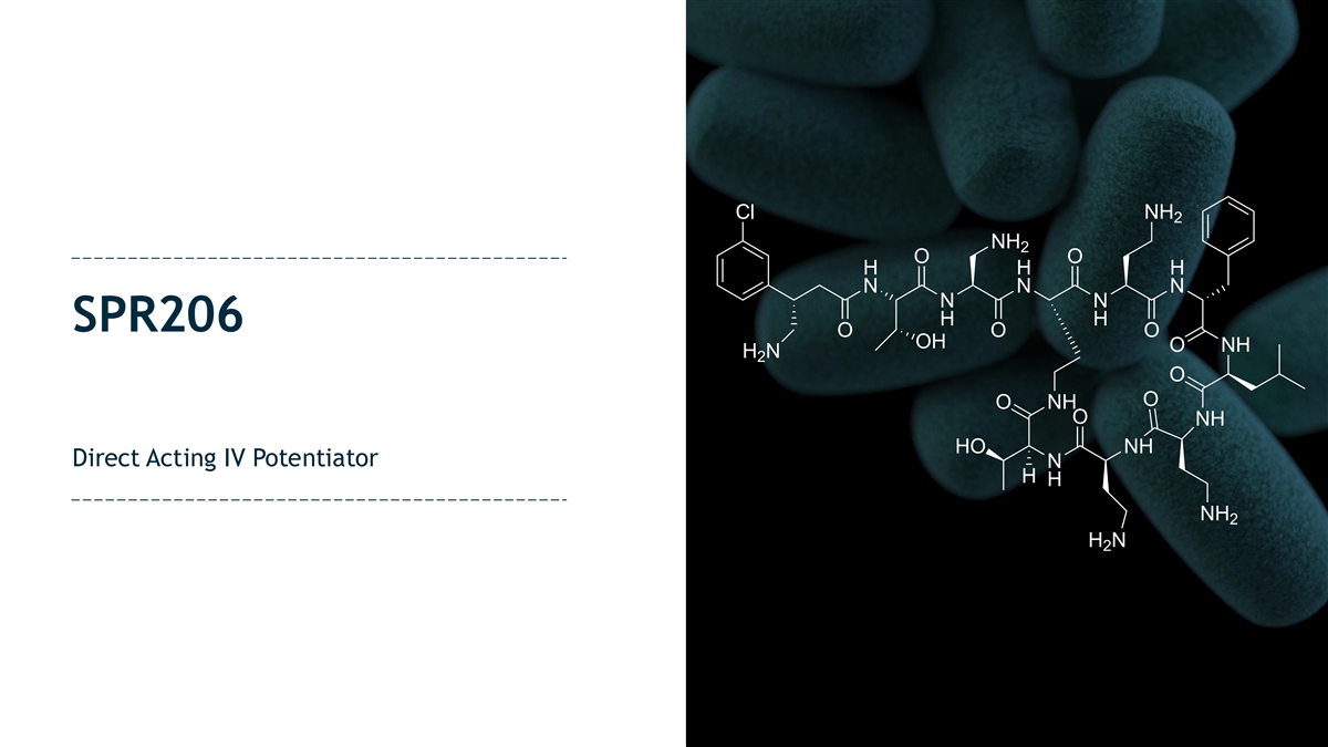 SPR206: Ongoing Clinical Development Lends Potential to Address Significant Unmet Need • Innovative, investigational IV direct-acting polymyxin antibiotic • Destabilization of phospholipids and lipopolysaccharides (LPS) present • Increased permeability, cell membrane disruption, bacterial cell death • Received FDA Fast Track designation Current standard of care involves drug combinations that are often associated with nephrotoxicity Preclinical SAD/MAD Bronchoalveolar Renal Impairment 1 2 3 Studies Phase 1 Trial Lavage Phase 1 Trial Phase 1 Trial Support increased efficacy beyond No evidence of nephrotoxicity at Well-tolerated and achieved lung Supportive of renal dosing in subsequent trials for patients impacted by traditional antibiotics and potential for predicted therapeutic dose levels exposures consistent with predicted differences in renal function single agent activity therapeutic levels 4 Next Steps: Phase 2 HABP/VABP Proof of Concept Study SPR206 has potential to fulfill unmet need for a well tolerated, efficacious therapeutic against carbapenem-resistant pathogens HABP: hospital-acquired bacterial pneumonia; MAD: multiple ascending dose; SAD: single ascending dose; VABP: ventilator-associated bacterial pneumonia. 1. Bruss J, et al. Antimicrob Agents Chemother 2021;65:e0073921; 26 2.Rodvold KA, et al. Antimicrob Agents Chemother 2023;67:e0042623. 3. Bruss JB, et al. Antimicrob Agents Chemother 2023;67:e0050523; 4. Contingent on non-dilutive funding availability.