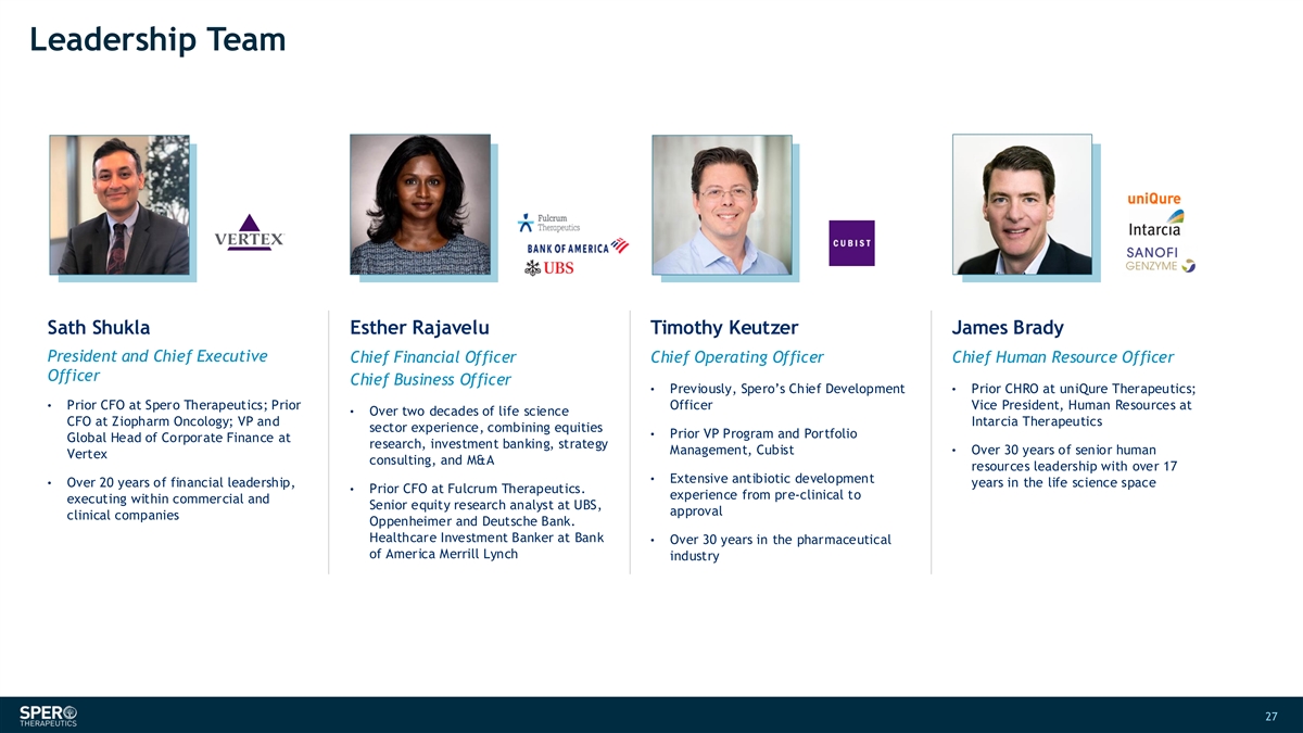 Leadership Team Sath Shukla Esther Rajavelu Timothy Keutzer James Brady President and Chief Executive Chief Financial Officer Chief Operating Officer Chief Human Resource Officer Officer Chief Business Officer • Previously, Spero’s Chief Development • Prior CHRO at uniQure Therapeutics; • Prior CFO at Spero Therapeutics; Prior Officer Vice President, Human Resources at • Over two decades of life science CFO at Ziopharm Oncology; VP and Intarcia Therapeutics sector experience, combining equities • Prior VP Program and Portfolio Global Head of Corporate Finance at research, investment banking, strategy Management, Cubist• Over 30 years of senior human Vertex consulting, and M&A resources leadership with over 17 • Extensive antibiotic development • Over 20 years of financial leadership, years in the life science space • Prior CFO at Fulcrum Therapeutics. experience from pre-clinical to executing within commercial and Senior equity research analyst at UBS, approval clinical companies Oppenheimer and Deutsche Bank. Healthcare Investment Banker at Bank • Over 30 years in the pharmaceutical of America Merrill Lynch industry 27