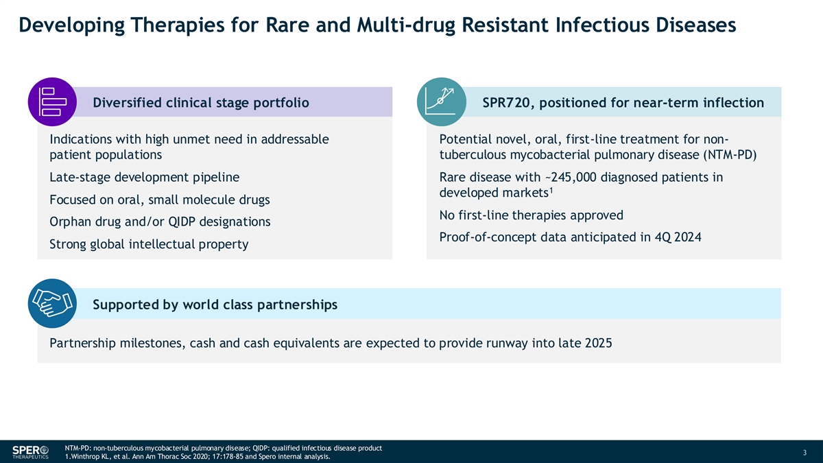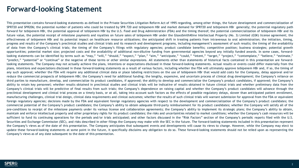 Forward-looking Statement This presentation contains forward-looking statements as defined in the Private Securities Litigation Reform Act of 1995 regarding, among other things, the future development and commercialization of SPR720 and SPR206; the potential number of patients who could be treated by SPR 720 and tebipenem HBr and market demand for SPR720 and tebipenem HBr generally; the potential regulatory path forward for tebipenem HBr, the potential approval of tebipenem HBr by the U.S. Food and Drug Administration (FDA) and the timing thereof; the potential commercialization of tebipenem HBr and its future value, the potential receipt of milestone payments and royalties on future sales of tebipenem HBr under the GlaxoSmithKline Intellectual Property (No. 3) Limited (GSK) license agreement; the effectiveness of tebipenem HBr and its potential impact on healthcare resource utilizations; the anticipated shift in treating patients from intravenous to oral administration; the initiation, timing, progress and results of the Company’s preclinical studies and clinical trials and its research and development programs, including management’s assessment of such results; the timing of the availability of data from the Company’s clinical trials; the timing of the Company’s filings with regulatory agencies; product candidate benefits; competitive position; business strategies; potential growth opportunities; potential market size; projected costs and the availability of additional non-dilutive funding from governmental agencies beyond any initially funded awards. In some cases, forward- looking statements can be identified by terms such as “may,” “will,” “should,” “expect,” “plan,” “aim,” “anticipate,” “could,” “intent,” “target,” “project,” “contemplate,” “believe,” “estimate,” “predict,” “potential” or “continue” or the negative of these terms or other similar expressions. All statements other than statements of historical facts contained in this presentation are forward- looking statements. The Company may not actually achieve the plans, intentions or expectations disclosed in these forward-looking statements. Actual results or events could differ materially from the plans, intentions and expectations disclosed in these forward-looking statements as a result of various factors, including whether the FDA will ultimately approve tebipenem HBr and, if so, the timing of any such approval; whether the FDA will require any additional clinical data or place labeling restrictions on the use of tebipenem HBr that would add costs for the Company, delay approval and/or reduce the commercial prospects of tebipenem HBr; the Company’s need for additional funding; the lengthy, expensive, and uncertain process of clinical drug development; the Company’s reliance on third parties to manufacture, develop, and commercialize its product candidates, if approved; the ability to develop and commercialize the Company’s product candidates, if approved; the Company’s ability to retain key personnel; whether results obtained in preclinical studies and clinical trials will be indicative of results obtained in future clinical trials and whether preliminary data from the Company’s clinical trials will be predictive of final results from such trials; the Company’s dependence on raising capital and whether the Company’s product candidates will advance through the preclinical development and clinical trial process on a timely basis, or at all, taking into account such factors as the effects of possible regulatory delays, slower than anticipated patient enrollment, manufacturing challenges, clinical trial design, clinical data requirements and clinical outcomes; whether the results of such clinical trials will warrant submission for approval from the FDA or equivalent foreign regulatory agencies; decisions made by the FDA and equivalent foreign regulatory agencies with respect to the development and commercialization of the Company’s product candidates; the commercial potential of the Company’s product candidates; the Company’s ability to obtain adequate third-party reimbursement for its product candidates; whether the Company will satisfy all of the pre-conditions to receipt of the milestone payments under its various license and collaboration agreements; the Company’s ability to implement its strategic plans; the Company’s ability to obtain, maintain and enforce intellectual property and other proprietary rights for its product candidates; the risks and uncertainties related to market conditions; whether the Company’s cash resources will be sufficient to fund its continuing operations for the periods and/or trials anticipated; and other factors discussed in the “Risk Factors” section of the Company’s periodic reports filed with the U.S. Securities and Exchange Commission (SEC), and risks described in other filings the Company may make with the SEC in the future. The forward-looking statements included in this presentation represent the Company’s views as of the date of this presentation. The Company anticipates that subsequent events and developments will cause its views to change. However, while the Company may elect to update these forward-looking statements at some point in the future, it specifically disclaims any obligation to do so. These forward-looking statements should not be relied upon as representing the Company’s views as of any date subsequent to the date of this presentation. 2