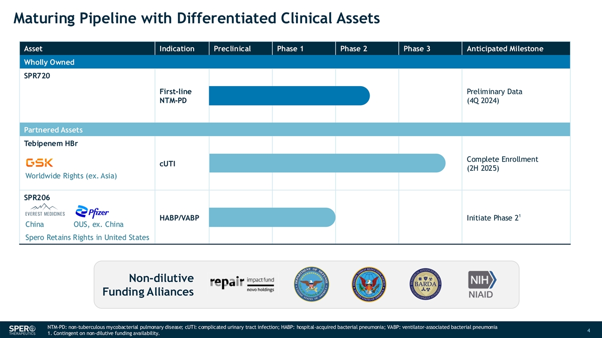 Developing Therapies for Rare and Multi-drug Resistant Infectious Diseases Diversified clinical stage portfolio SPR720, positioned for near-term inflection Indications with high unmet need in addressable Potential novel, oral, first-line treatment for non- patient populations tuberculous mycobacterial pulmonary disease (NTM-PD) Late-stage development pipeline Rare disease with ~245,000 diagnosed patients in 1 developed markets Focused on oral, small molecule drugs No first-line therapies approved Orphan drug and/or QIDP designations Proof-of-concept data anticipated in 4Q 2024 Strong global intellectual property Supported by world class partnerships Partnership milestones, cash and cash equivalents are expected to provide runway into late 2025 NTM-PD: non-tuberculous mycobacterial pulmonary disease; QIDP: qualified infectious disease product 3 1.Winthrop KL, et al. Ann Am Thorac Soc 2020; 17:178-85 and Spero internal analysis.