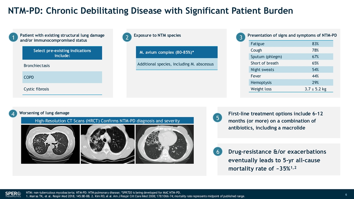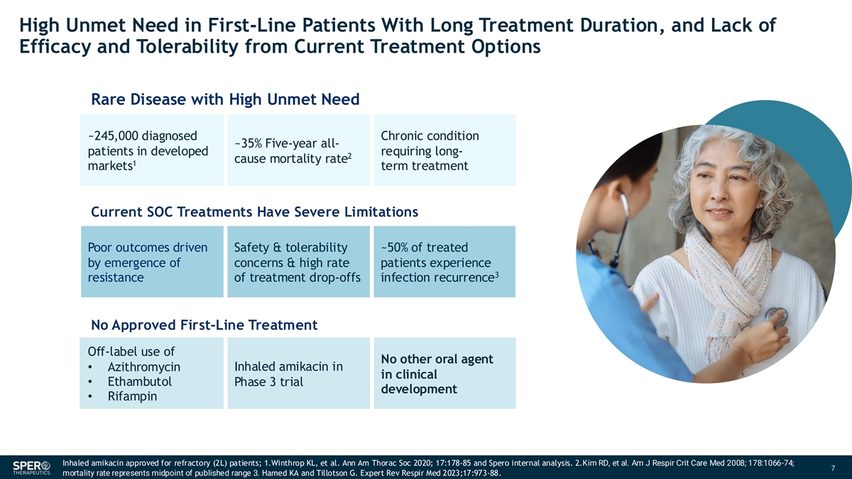 NTM-PD: Chronic Debilitating Disease with Significant Patient Burden Patient with existing structural lung damage Exposure to NTM species Presentation of signs and symptoms of NTM-PD 1 2 3 and/or immunocompromised status Fatigue 83% Cough 78% Select pre-existing indications M. avium complex (80-85%)* include: Sputum (phlegm) 67% Short of breath 65% Additional species, including M. abscessus Bronchiectasis Night sweats 54% Fever 44% COPD Hemoptysis 29% Cystic fibrosis Weight loss 3.7 ± 5.2 kg Worsening of lung damage First-line treatment options include 6-12 4 5 High-Resolution CT Scans (HRCT) Confirms NTM-PD diagnosis and severity months (or more) on a combination of antibiotics, including a macrolide Drug-resistance &/or exacerbations 6 eventually leads to 5-yr all-cause 1,2 mortality rate of ~35% NTM: non-tuberculous mycobacteria; NTM-PD: NTM pulmonary disease; *SPR720 is being developed for MAC NTM-PD. 6 1. Marras TK, et al. Respir Med 2018; 145:80-88. 2. Kim RD, et al. Am J Respir Crit Care Med 2008; 178:1066-74; mortality rate represents midpoint of published range.