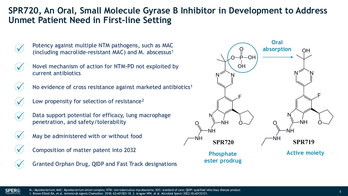High Unmet Need in First-Line Patients With Long Treatment Duration, and Lack of Efficacy and Tolerability from Current Treatment Options Rare Disease with High Unmet Need ~245,000 diagnosed Chronic condition ~35% Five-year all- patients in developed requiring long- 2 cause mortality rate 1 markets term treatment Current SOC Treatments Have Severe Limitations Poor outcomes driven Safety & tolerability ~50% of treated by emergence of concerns & high rate patients experience 3 resistance of treatment drop-offs infection recurrence No Approved First-Line Treatment Off-label use of No other oral agent Inhaled amikacin in • Azithromycin in clinical • Ethambutol Phase 3 trial development • Rifampin Inhaled amikacin approved for refractory (2L) patients; 1.Winthrop KL, et al. Ann Am Thorac Soc 2020; 17:178-85 and Spero internal analysis. 2.Kim RD, et al. Am J Respir Crit Care Med 2008; 178:1066-74; 7 mortality rate represents midpoint of published range 3. Hamed KA and Tillotson G. Expert Rev Respir Med 2023;17:973-88.