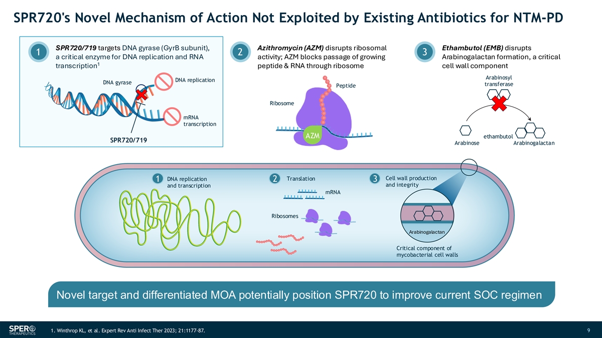 SPR720, An Oral, Small Molecule Gyrase B Inhibitor in Development to Address Unmet Patient Need in First-line Setting Oral Potency against multiple NTM pathogens, such as MAC absorption 1 (including macrolide-resistant MAC) and M. abscessus Novel mechanism of action for NTM-PD not exploited by current antibiotics 1 No evidence of cross resistance against marketed antibiotics 2 Low propensity for selection of resistance Data support potential for efficacy, lung macrophage penetration, and safety/tolerability May be administered with or without food Composition of matter patent into 2032 Active moiety Phosphate ester prodrug Granted Orphan Drug, QIDP and Fast Track designations M.: Mycobacterium; MAC: Mycobacterium avium complex; NTM: non-tuberculous mycobacteria; SOC: standard of care; QIDP: qualified infectious disease product 8 1. Brown-Elliott BA, et al. Antimicrob Agents Chemother. 2018; 62:e01503-18. 2. Aragaw WW, et al. Microbiol Spectr 2022;10:e0132121.