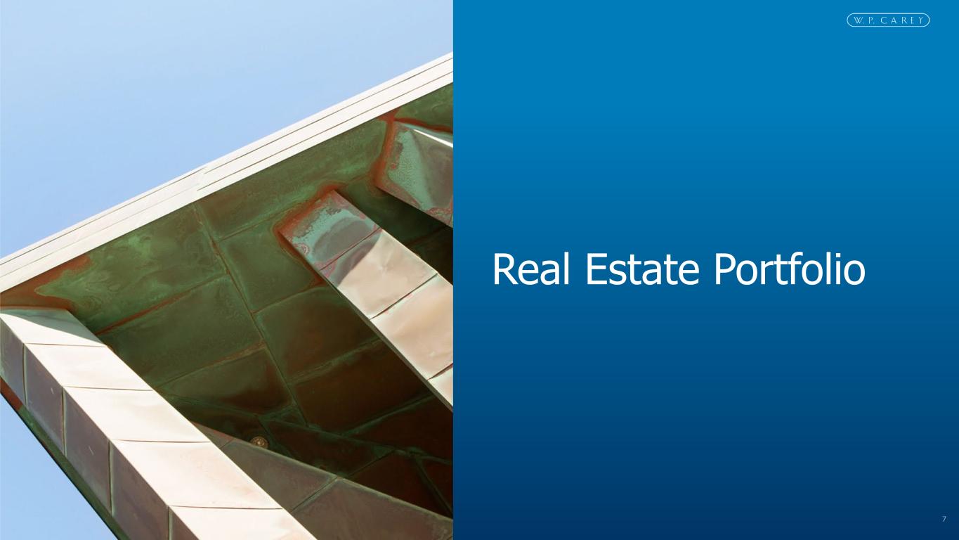 6 • Asset management offices in New York and Amsterdam • W. P. Carey has proven experience repositioning assets through re-leasing, restructuring and strategic disposition • Generates value creation opportunities within our existing portfolio • Five-point internal rating scale used to assess and monitor tenant credit and the quality, location and criticality of each asset Domestic and international asset management capabilities to address lease expirations, changing tenant credit profiles and asset repositioning or dispositions Proactive Asset Management Asset Management Risk AnalysisAsset Management Expertise Bankruptcy Watch List Implied IG Investment Grade StableTenant Credit Obsolete Residual Risk Stable Class B Class AAsset Quality Not Critical Non- Renewal Possible Renewal Critical- Renewal Likely Highly CriticalAsset Criticality Asset Location No Tenant Demand Limited Tenant Demand / Challenging Location Alternative Tenant Demand Good Location / Active Market Prime Location / High Tenant Demand Operational • Lease compliance • Insurance • Property inspections • Non-triple net lease administration • Real estate tax • Projections and portfolio valuation • Carbon emissions tracking and reporting Transaction • Leasing • Dispositions • Lease modifications • Credit and real estate risk analysis • Building expansions and redevelopment • Tenant distress and restructuring • Green Building Certifications (LEED, BREEAM) • Sustainability Solutions (solar, LED lighting, HVAC upgrades) Risk Management Scale