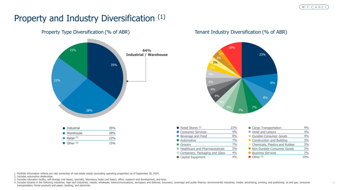 10 Tenant Description Number of Properties ABR ($ millions) WALT (years) % of Total Distribution facilities and manufacturing facility in the U.S. leased to global hardware wholesaler (5) 9 19 13.8 1.4% Distribution facilities and retail properties in Lithuania, Estonia and Latvia leased to European DIY retailer 20 19 7.4 1.4% Production, packaging and distribution facilities in the U.S. leased to North American contract food manufacturer 18 17 17.8 1.3% Logistics and cold storage warehouse facilities in the Netherlands leased to European supermarket chain 5 16 4.4 1.2% Distribution facilities in Demark leased to Danish freight company 15 14 12.4 1.0% Retail properties in the Netherlands leased to European DIY retailer 36 14 8.8 1.0% Top 20 Total 472 $446 14.1 yrs 33.4% Retail properties and single distribution facility in the U.S. leased to sporting good retailer 9 13 6.2 1.0% Distribution facility in Kentucky leased to global provider of consumer products and adhesives 1 12 17.6 0.9% Cold storage warehouse facilities in the Los Angeles and San Francisco areas leased to publicly traded cold storage REIT 4 12 6.2 0.9% Logistics facilities in the Czech Republic, Poland and Slovakia leased to French third-party logistics provider 4 12 1.1 0.8% Distribution facilities in the U.S. leased to global hardware distributor 4 11 17.7 0.8% Top 25 Total 494 $505 13.6 yrs 37.8% Top 25 Net Lease Tenants (continued) (1) 1. Portfolio information reflects pro rata ownership of real estate assets (excluding operating properties) as of September 30, 2024. 2. ABR from these properties is denominated in U.S. dollars. 3. During the first quarter of 2024, we entered into a lease restructuring with Hellweg, which included (i) abated rent from January 1, 2024 to March 31, 2024, (ii) a €4.0 million reduction in annual base rent and (iii) a seven-year lease extension, with a new lease maturity of February 2044. 4. Of the 23 properties leased to the tenant, nine are located in Canada, eight are located in the United States and six are located in Mexico. 5. In October 2024, this tenant announced that it had initiated voluntary Chapter 11 bankruptcy proceedings and had entered an agreement to sell substantially all of its business operations. This tenant remains current on rent, having paid substantially all rent owed through the end of the year.
