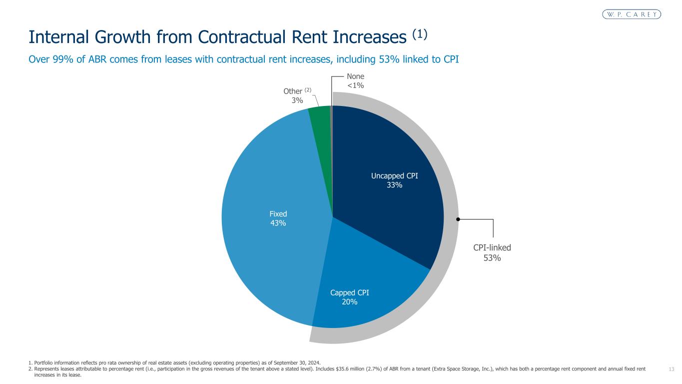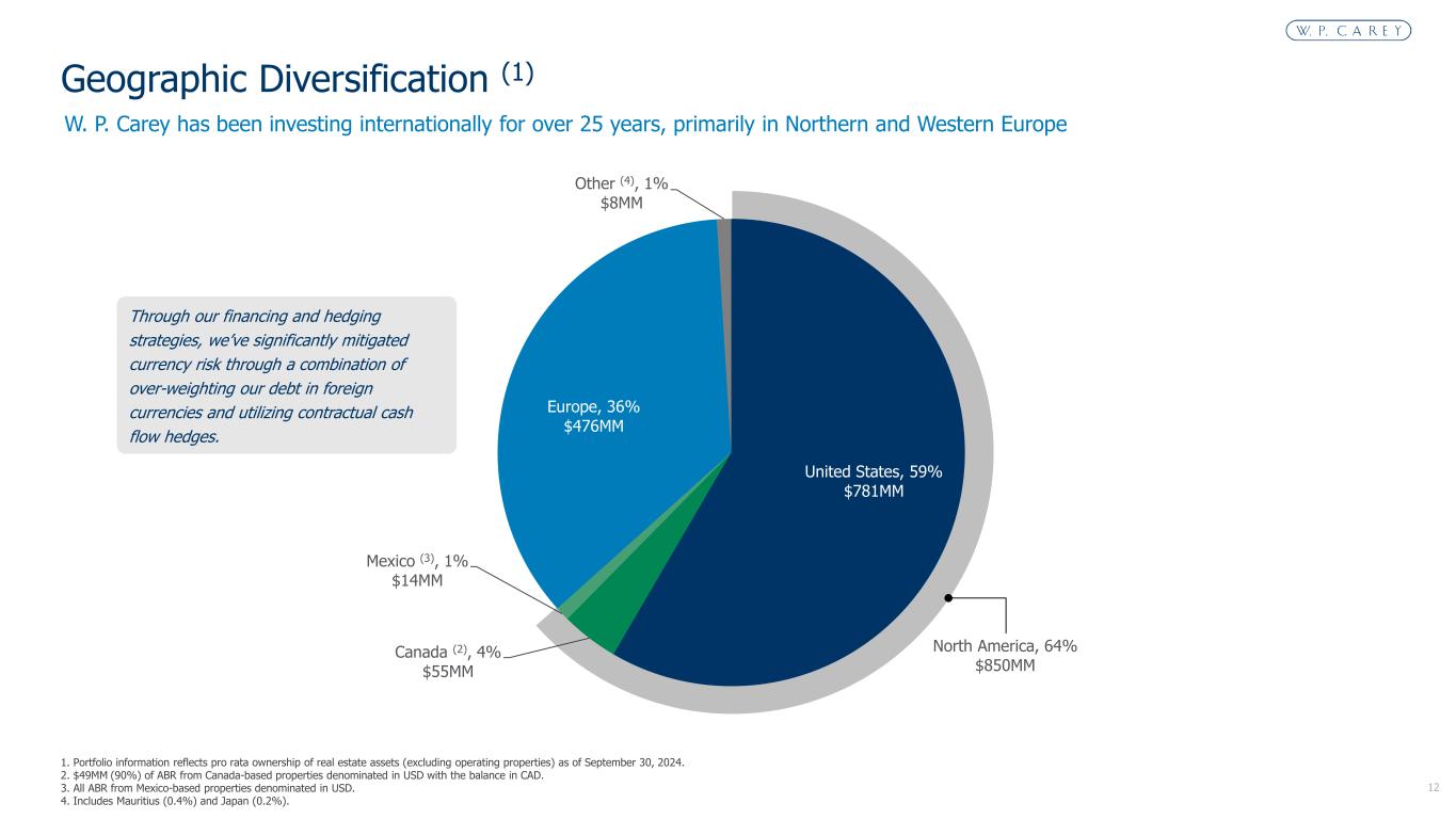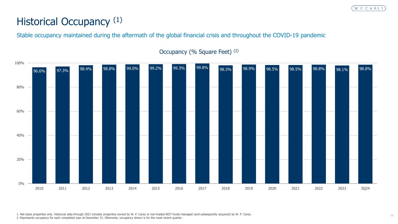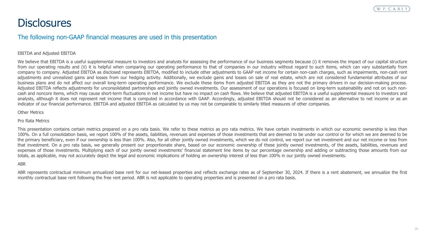 25 Certain of the matters discussed in this communication constitute forward-looking statements within the meaning of the Securities Act of 1933 (as amended, the “Securities Act”) and the Securities Exchange Act of 1934 (as amended, the “Exchange Act”), both as amended by the Private Securities Litigation Reform Act of 1995. The forward-looking statements include, among other things, statements regarding the intent, belief or expectations of the Company and can be identified by the use of words such as “may,” “will,” “should,” “would,” “will be,” “will continue,” “will likely result,” “believe,” “project,” “expect,” “anticipate,” “intend,” “estimate” “opportunities,” “possibility,” “strategy,” “maintain” or the negative version of these words and other comparable terms. These forward- looking statements include, but are not limited to, statements that are not historical facts. These statements are based on the current expectations of our management, and it is important to note that our actual results could be materially different from those projected in such forward- looking statements. There are a number of risks and uncertainties that could cause actual results to differ materially from the forward-looking statements. Other unknown or unpredictable risks or uncertainties, like the risks related to fluctuating interest rates, the impact of inflation on our tenants and us, the effects of pandemics and global outbreaks of contagious diseases and domestic or geopolitical crises, such as terrorism, military conflict, war or the perception that hostilities may be imminent, political instability or civil unrest, or other conflict, and those additional risk factors discussed in reports that we have filed with the SEC, could also have material adverse effects on our future results, performance or achievements. Discussions of some of these other important factors and assumptions are contained in W. P. Carey’s filings with the SEC and are available at the SEC’s website at http://www.sec.gov, including Part I, Item 1A. Risk Factors in W. P. Carey’s Annual Report on Form 10-K for the fiscal year ended December 31, 2023. Investors are cautioned not to place undue reliance on these forward-looking statements, which speak only as of the date of this communication, unless noted otherwise. Except as required under the federal securities laws and the rules and regulations of the SEC, W. P. Carey does not undertake any obligation to release publicly any revisions to the forward-looking statements to reflect events or circumstances after the date of this communication or to reflect the occurrence of unanticipated events. All data presented herein is as of September 30, 2024 unless otherwise noted. Amounts may not sum to totals due to rounding. Past performance does not guarantee future results. Cautionary Statement Concerning Forward-Looking Statements