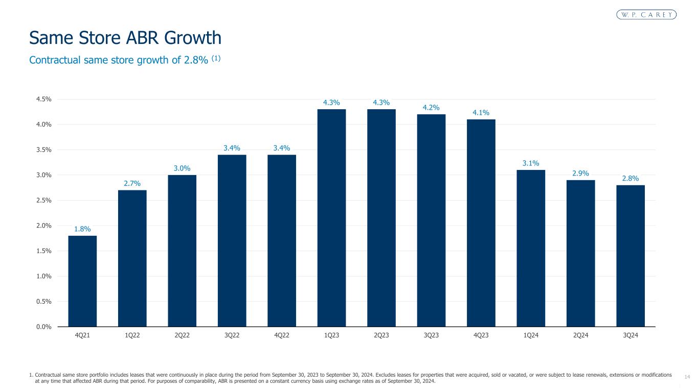 13 Uncapped CPI 33% Fixed 43% Capped CPI 20% Other (2) 3% CPI-linked 53% None <1% 1. Portfolio information reflects pro rata ownership of real estate assets (excluding operating properties) as of September 30, 2024. 2. Represents leases attributable to percentage rent (i.e., participation in the gross revenues of the tenant above a stated level). Includes $35.6 million (2.7%) of ABR from a tenant (Extra Space Storage, Inc.), which has both a percentage rent component and annual fixed rent increases in its lease. Over 99% of ABR comes from leases with contractual rent increases, including 53% linked to CPI Internal Growth from Contractual Rent Increases (1)