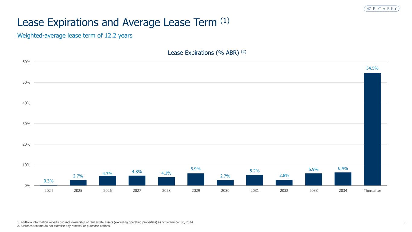 14 1.8% 2.7% 3.0% 3.4% 3.4% 4.3% 4.3% 4.2% 4.1% 3.1% 2.9% 2.8% 0.0% 0.5% 1.0% 1.5% 2.0% 2.5% 3.0% 3.5% 4.0% 4.5% 4Q21 1Q22 2Q22 3Q22 4Q22 1Q23 2Q23 3Q23 4Q23 1Q24 2Q24 3Q24 1. Contractual same store portfolio includes leases that were continuously in place during the period from September 30, 2023 to September 30, 2024. Excludes leases for properties that were acquired, sold or vacated, or were subject to lease renewals, extensions or modifications at any time that affected ABR during that period. For purposes of comparability, ABR is presented on a constant currency basis using exchange rates as of September 30, 2024. Contractual same store growth of 2.8% (1) Same Store ABR Growth