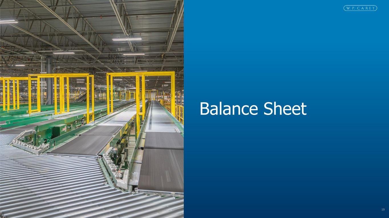 18 Capital investments have become a more meaningful part of our investment activity and allow us to pursue follow-on opportunities with existing tenants Recent Capital Investments Investment: $14 million expansion Facility Type: Industrial Location: Salisbury, NC Additional Gross Square Footage: 125,549 Lease Term: 15-year lease* Rent Escalation: Fixed Hexagon Composites Completed March 2024 Investment: $2 million renovation Facility Type: Warehouse Location: Fredericia, Denmark Additional Gross Square Footage: N/A Lease Term: 17-year lease* Rent Escalation: Danish CPI Danske Completed April 2024 Investment: $14 million redevelopment Facility Type: Industrial Location: Irvine, CA Additional Gross Square Footage: 94,195 Lease Term: 10-year lease Rent Escalation: Fixed Terran Orbital Completed June 2024 Capital Investments – Case Studies * As part of the transaction, WPC’s existing lease on the entire facility was reset to a term of 15 years. * As part of the transaction, WPC’s existing lease on the entire facility was extended by 5 years.