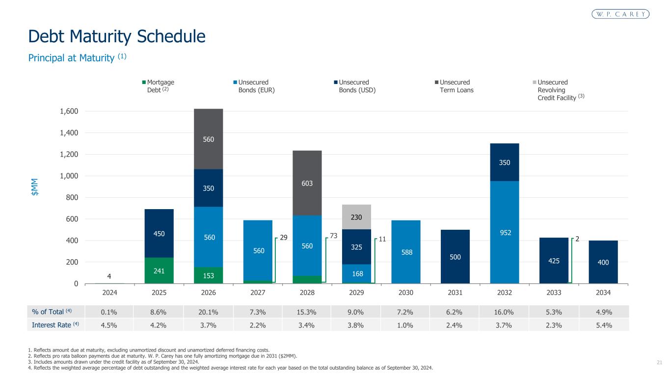 21 % of Total (4) 0.1% 8.6% 20.1% 7.3% 15.3% 9.0% 7.2% 6.2% 16.0% 5.3% 4.9% Interest Rate (4) 4.5% 4.2% 3.7% 2.2% 3.4% 3.8% 1.0% 2.4% 3.7% 2.3% 5.4% $M M 1. Reflects amount due at maturity, excluding unamortized discount and unamortized deferred financing costs. 2. Reflects pro rata balloon payments due at maturity. W. P. Carey has one fully amortizing mortgage due in 2031 ($2MM). 3. Includes amounts drawn under the credit facility as of September 30, 2024. 4. Reflects the weighted average percentage of debt outstanding and the weighted average interest rate for each year based on the total outstanding balance as of September 30, 2024. 4 241 153 29 73 11 2 560 560 560 168 588 952 450 350 325 500 350 425 400 560 603 230 0 200 400 600 800 1,000 1,200 1,400 1,600 1,800 2024 2025 2026 2027 2028 2029 2030 2031 2032 2033 2034 Mortgage Debt Unsecured Bonds (EUR) Unsecured Bonds (USD) Unsecured Term Loans Unsecured Revolving Credit Facility (2) (3) Debt Maturity Schedule Principal at Maturity (1)