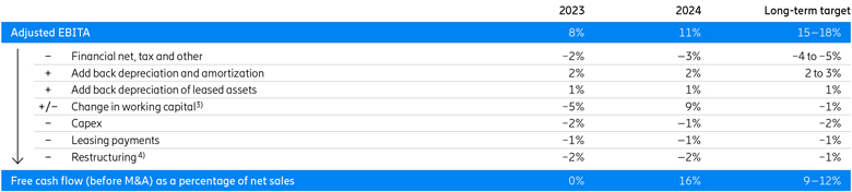 Adjusted EBITA margin 15–18% Important drivers – Increased IPR revenues – Market and product mix – Operational leverage | Free cash flow before M&A as a percentage of net sales 9–12% Focus – Delivering high cash conversion from EBITA | – Net Zero carbon emissions across value chain by 2040 1) .– Zero fatalities and lost workday incidents by 2025. Outcome 2024: 2 fatalities and 72 lost workday incidents. – 30% female representation among employees and managers by 2030. | ||||