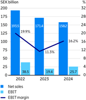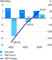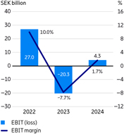 | – | EBIT (loss) amounted to SEK 4.3 (–20.3) billion, with an EBIT margin of 1.7% (–7.7%). Adjusted EBIT (loss) was SEK 9.3 (–13.8) billion with an adjusted EBIT margin of 3.8% (–5.2%). |