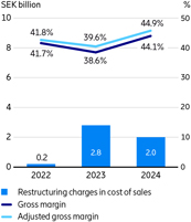 | – | Gross income increased to SEK 109.4 (101.6) billion with an increase in all segments. Gross margin was 44.1% (38.6%). Adjusted gross income was SEK 111.4 (104.4) billion, with a margin of 44.9% (39.6%). |