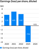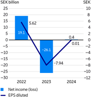 | – | Net income (loss) was SEK 0.4 (–26.1) billion. Earnings per share (EPS) diluted was SEK 0.01 (–7.94). |