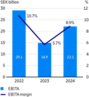 | – | EBITA increased to SEK 22.1 (14.9) billion with a EBITA margin of 8.9% (5.7%). Adjusted EBITA was SEK 27.2 (21.4) billion with an adjusted EBITA margin of 11.0% (8.1%). |