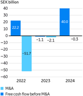 | – | Cash flow from operating activities was SEK 46.3 (7.2) billion. Free cash flow before M&A amounted to SEK 40.0 (–1.1) billion. |