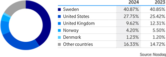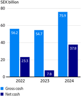 | – | Cash and cash equivalents was SEK 43.9 (35.2) billion and net cash was SEK 37.8 (7.8) billion on December 31, 2024. |