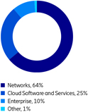Cloud Software and Services provides solutions that equip communications service providers with the ability to enhance their business agility, service experience, and operational efficiency. Ericsson’s offerings for Core Networks, Business and Operations Support Systems (OSS/BSS), Network Management, Cognitive Network Solutions and Managed Networks Services enable customers to evolve to programmable and autonomous networks using AI. – Core Networks: serve as the backbone that transfer network traffic at high speed. – Business and Operations Support Systems: enable the communications service providers to monetize and orchestrate the capabilities of the network. – Network Management and Cognitive Network Solutions: provide capabilities that manage and optimize the networks. – Managed Networks Services: data driven operations of customer networks. | Net sales, share of Group ![]() | Net sales, SEK billion ![]() | ||||