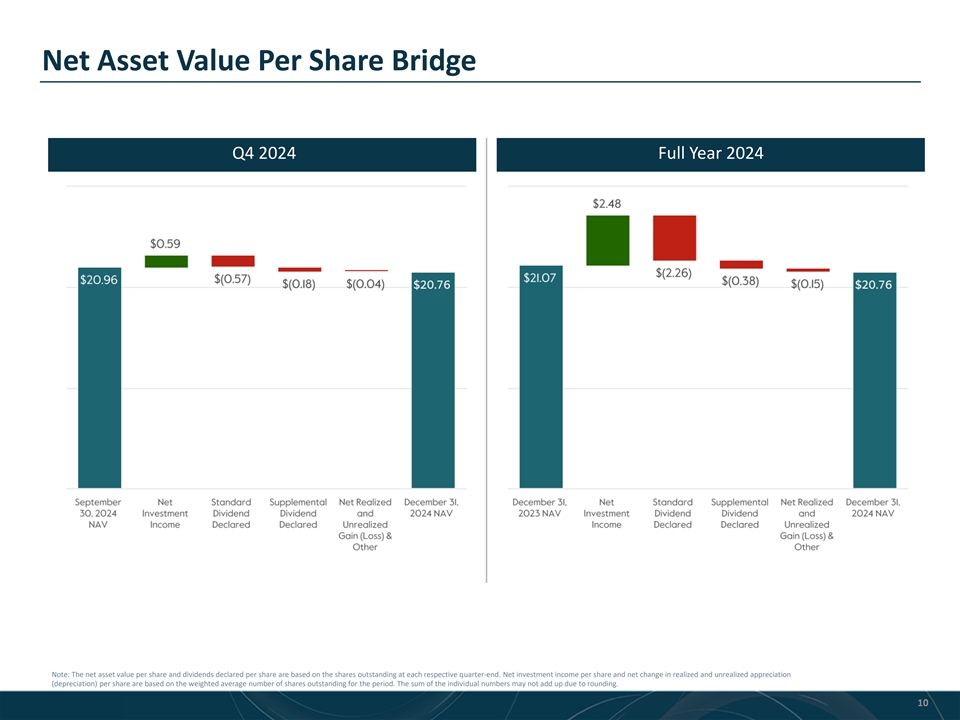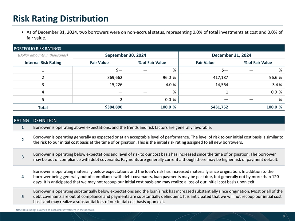 Risk Rating Distribution • As of December 31, 2024, two borrowers were on non-accrual status, representing 0.0% of total investments at cost and 0.0% of fair value. PORTFOLIO RISK RATINGS (Dollar amounts in thousands) September 30, 2024 December 31, 2024 Internal Risk Rating Fair Value % of Fair Value Fair Value % of Fair Value 1 $— — % $— — % 2 369,662 96.0 % 417,187 96.6 % 3 15,226 4.0 % 14,564 3.4 % 4 — — % 1 0.0 % 5 2 0.0 % — — % $384,890 100.0 % $431,752 100.0 % Total RATING DEFINITION 1 Borrower is operating above expectations, and the trends and risk factors are generally favorable. Borrower is operating generally as expected or at an acceptable level of performance. The level of risk to our initial cost basis is similar to 2 the risk to our initial cost basis at the time of origination. This is the initial risk rating assigned to all new borrowers. Borrower is operating below expectations and level of risk to our cost basis has increased since the time of origination. The borrower 3 may be out of compliance with debt covenants. Payments are generally current although there may be higher risk of payment default. Borrower is operating materially below expectations and the loan’s risk has increased materially since origination. In addition to the 4 borrower being generally out of compliance with debt covenants, loan payments may be past due, but generally not by more than 120 days. It is anticipated that we may not recoup our initial cost basis and may realize a loss of our initial cost basis upon exit. Borrower is operating substantially below expectations and the loan’s risk has increased substantially since origination. Most or all of the 5 debt covenants are out of compliance and payments are substantially delinquent. It is anticipated that we will not recoup our initial cost basis and may realize a substantial loss of our initial cost basis upon exit. Note: Risk ratings assigned to each debt investment in the portfolio. 9