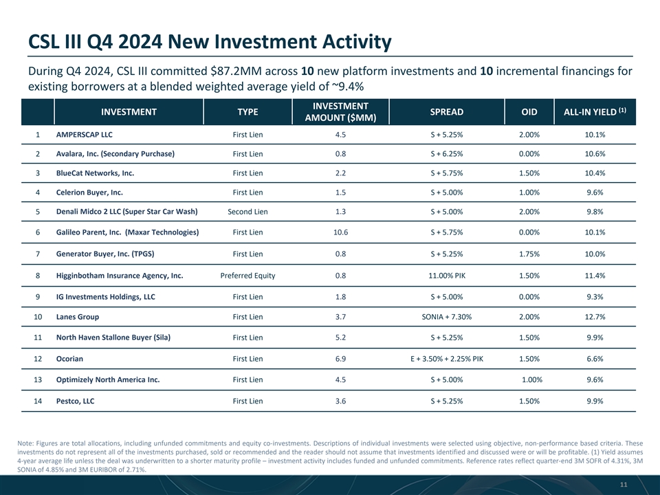 Net Asset Value Per Share Bridge Q4 2024 Full Year 2024 Note: The net asset value per share and dividends declared per share are based on the shares outstanding at each respective quarter-end. Net investment income per share and net change in realized and unrealized appreciation (depreciation) per share are based on the weighted average number of shares outstanding for the period. The sum of the individual numbers may not add up due to rounding. 10