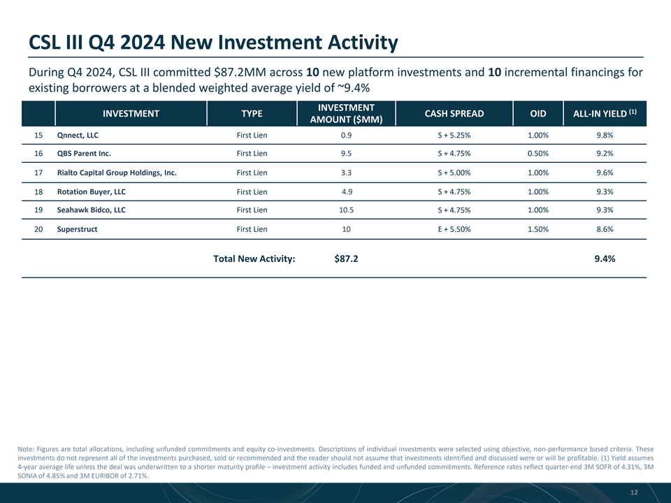 CSL III Q4 2024 New Investment Activity During Q4 2024, CSL III committed $87.2MM across 10 new platform investments and 10 incremental financings for existing borrowers at a blended weighted average yield of ~9.4% INVESTMENT (1) INVESTMENT TYPE SPREAD OID ALL-IN YIELD AMOUNT ($MM) 1 AMPERSCAP LLC First Lien 4.5 S + 5.25% 2.00% 10.1% 2 Avalara, Inc. (Secondary Purchase) First Lien 0.8 S + 6.25% 0.00% 10.6% 3 BlueCat Networks, Inc. First Lien 2.2 S + 5.75% 1.50% 10.4% 4 Celerion Buyer, Inc. First Lien 1.5 S + 5.00% 1.00% 9.6% 5 Denali Midco 2 LLC (Super Star Car Wash) Second Lien 1.3 S + 5.00% 2.00% 9.8% 6 Galileo Parent, Inc. (Maxar Technologies) First Lien 10.6 S + 5.75% 0.00% 10.1% 7 Generator Buyer, Inc. (TPGS) First Lien 0.8 S + 5.25% 1.75% 10.0% 8 Higginbotham Insurance Agency, Inc. Preferred Equity 0.8 11.00% PIK 1.50% 11.4% 9 IG Investments Holdings, LLC First Lien 1.8 S + 5.00% 0.00% 9.3% 10 Lanes Group First Lien 3.7 SONIA + 7.30% 2.00% 12.7% 11 North Haven Stallone Buyer (Sila) First Lien 5.2 S + 5.25% 1.50% 9.9% 12 Ocorian First Lien 6.9 E + 3.50% + 2.25% PIK 1.50% 6.6% 13 Optimizely North America Inc. First Lien 4.5 S + 5.00% 1.00% 9.6% Pestco, LLC 3.6 S + 5.25% 1.50% 9.9% 14 First Lien Note: Figures are total allocations, including unfunded commitments and equity co-investments. Descriptions of individual investments were selected using objective, non-performance based criteria. These investments do not represent all of the investments purchased, sold or recommended and the reader should not assume that investments identified and discussed were or will be profitable. (1) Yield assumes 4-year average life unless the deal was underwritten to a shorter maturity profile – investment activity includes funded and unfunded commitments. Reference rates reflect quarter-end 3M SOFR of 4.31%, 3M SONIA of 4.85% and 3M EURIBOR of 2.71%. 11