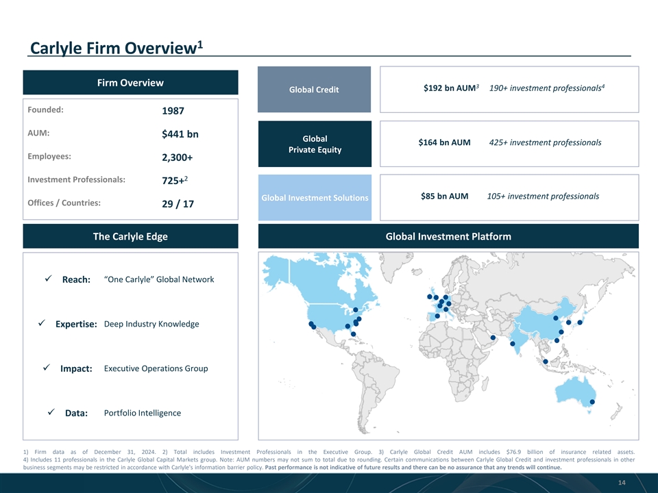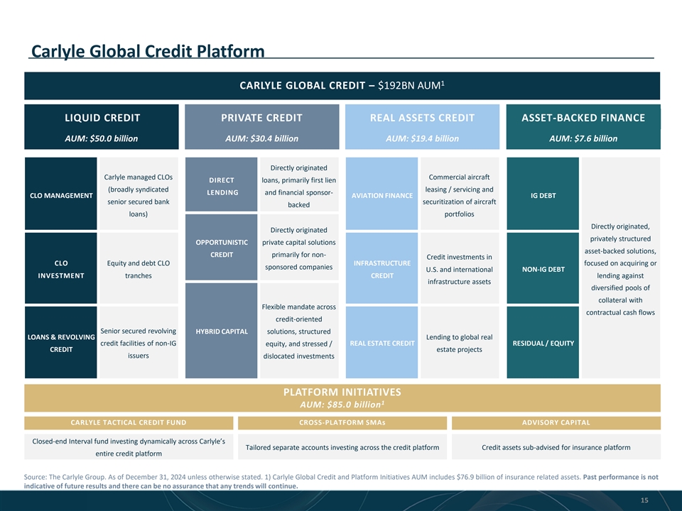 1 Carlyle Firm Overview Firm Overview 3 4 $192 bn AUM 190+ investment professionals Global Credit Founded: 1987 AUM: $441 bn Global $164 bn AUM 425+ investment professionals Private Equity Employees: 2,300+ 2 Investment Professionals: 725+ $85 bn AUM 105+ investment professionals Global Investment Solutions Offices / Countries: 29 / 17 The Carlyle Edge Global Investment Platform “One Carlyle” Global Network ✓ Reach: Deep Industry Knowledge ✓ Expertise: ✓ Impact: Executive Operations Group ✓ Data: Portfolio Intelligence 1) Firm data as of December 31, 2024. 2) Total includes Investment Professionals in the Executive Group. 3) Carlyle Global Credit AUM includes $76.9 billion of insurance related assets. 4) Includes 11 professionals in the Carlyle Global Capital Markets group. Note: AUM numbers may not sum to total due to rounding. Certain communications between Carlyle Global Credit and investment professionals in other business segments may be restricted in accordance with Carlyle's information barrier policy. Past performance is not indicative of future results and there can be no assurance that any trends will continue. 14