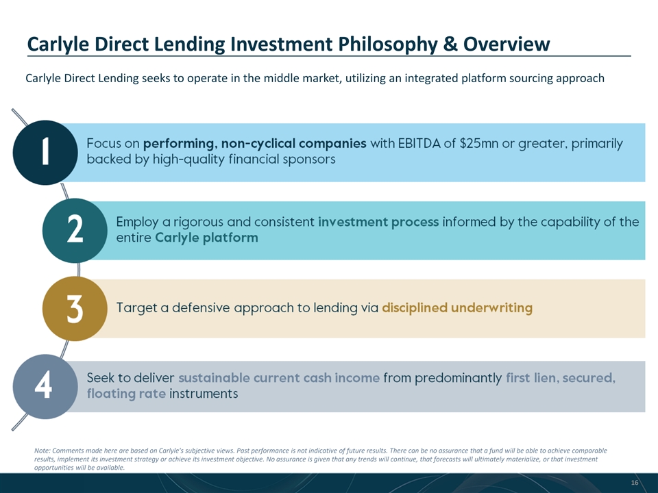 Carlyle Global Credit Platform 1 CARLYLE GLOBAL CREDIT – $192BN AUM LIQUID CREDIT PRIVATE CREDIT REAL ASSETS CREDIT ASSET-BACKED FINANCE AUM: $50.0 billion AUM: $30.4 billion AUM: $19.4 billion AUM: $7.6 billion Directly originated Carlyle managed CLOs Commercial aircraft DIRECT loans, primarily first lien (broadly syndicated leasing / servicing and LENDING and financial sponsor- CLO MANAGEMENT AVIATION FINANCE IG DEBT senior secured bank securitization of aircraft backed loans) portfolios Directly originated, Directly originated privately structured OPPORTUNISTIC private capital solutions asset-backed solutions, CREDIT primarily for non- Credit investments in CLO Equity and debt CLO INFRASTRUCTURE focused on acquiring or sponsored companies U.S. and international NON-IG DEBT INVESTMENT tranches CREDIT lending against infrastructure assets diversified pools of collateral with Flexible mandate across contractual cash flows credit-oriented Senior secured revolving HYBRID CAPITAL solutions, structured LOANS & REVOLVING Lending to global real credit facilities of non-IG REAL ESTATE CREDIT RESIDUAL / EQUITY equity, and stressed / CREDIT estate projects issuers dislocated investments PLATFORM INITIATIVES 1 AUM: $85.0 billion CARLYLE TACTICAL CREDIT FUND CROSS-PLATFORM SMAs ADVISORY CAPITAL Closed-end Interval fund investing dynamically across Carlyle’s Tailored separate accounts investing across the credit platform Credit assets sub-advised for insurance platform entire credit platform Source: The Carlyle Group. As of December 31, 2024 unless otherwise stated. 1) Carlyle Global Credit and Platform Initiatives AUM includes $76.9 billion of insurance related assets. Past performance is not indicative of future results and there can be no assurance that any trends will continue. 15