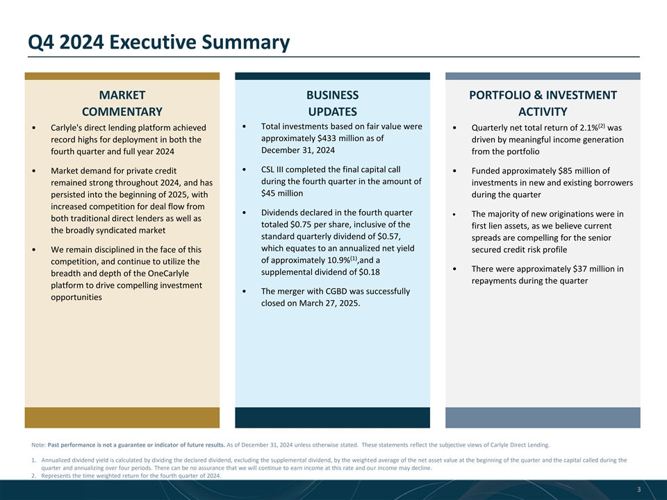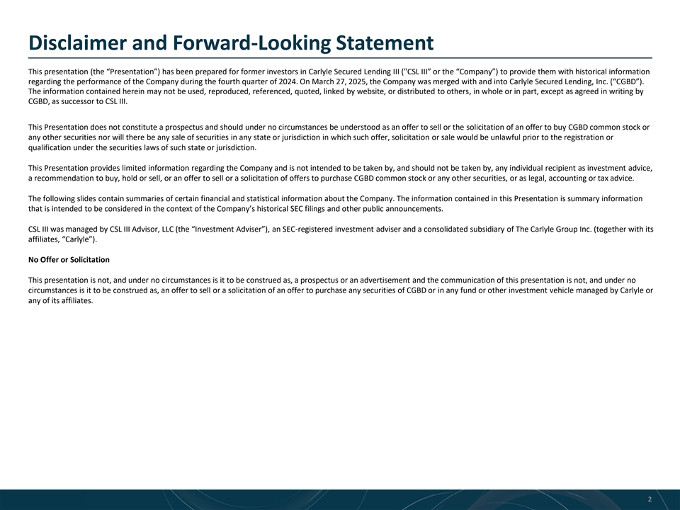 Disclaimer and Forward-Looking Statement This presentation (the “Presentation”) has been prepared for former investors in Carlyle Secured Lending III ( CSL III” or the “Company”) to provide them with historical information regarding the performance of the Company during the fourth quarter of 2024. On March 27, 2025, the Company was merged with and into Carlyle Secured Lending, Inc. (“CGBD”). The information contained herein may not be used, reproduced, referenced, quoted, linked by website, or distributed to others, in whole or in part, except as agreed in writing by CGBD, as successor to CSL III. This Presentation does not constitute a prospectus and should under no circumstances be understood as an offer to sell or the solicitation of an offer to buy CGBD common stock or any other securities nor will there be any sale of securities in any state or jurisdiction in which such offer, solicitation or sale would be unlawful prior to the registration or qualification under the securities laws of such state or jurisdiction. This Presentation provides limited information regarding the Company and is not intended to be taken by, and should not be taken by, any individual recipient as investment advice, a recommendation to buy, hold or sell, or an offer to sell or a solicitation of offers to purchase CGBD common stock or any other securities, or as legal, accounting or tax advice. The following slides contain summaries of certain financial and statistical information about the Company. The information contained in this Presentation is summary information that is intended to be considered in the context of the Company’s historical SEC filings and other public announcements. CSL III was managed by CSL III Advisor, LLC (the “Investment Adviser”), an SEC-registered investment adviser and a consolidated subsidiary of The Carlyle Group Inc. (together with its affiliates, “Carlyle”). No Offer or Solicitation This presentation is not, and under no circumstances is it to be construed as, a prospectus or an advertisement and the communication of this presentation is not, and under no circumstances is it to be construed as, an offer to sell or a solicitation of an offer to purchase any securities of CGBD or in any fund or other investment vehicle managed by Carlyle or any of its affiliates. 2