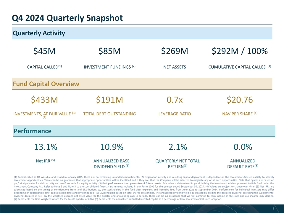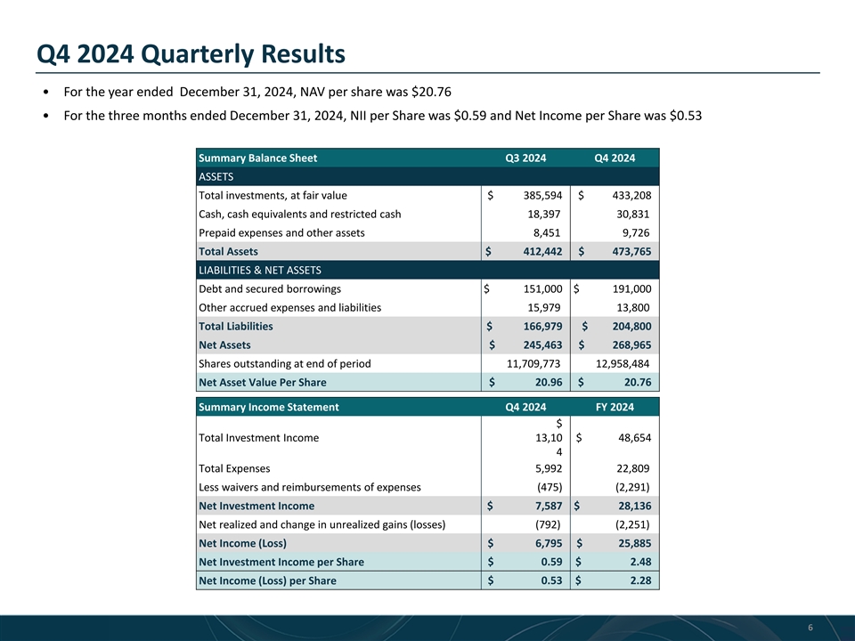 Q4 2024 Quarterly Snapshot Quarterly Activity $45M $85M $269M $292M / 100% (1) (2) (1) CAPITAL CALLED INVESTMENT FUNDINGS NET ASSETS CUMULATIVE CAPITAL CALLED Fund Capital Overview $433M $191M 0.7x $20.76 (3) (4) INVESTMENTS, AT FAIR VALUE TOTAL DEBT OUTSTANDING LEVERAGE RATIO NAV PER SHARE (4) Performance 13.1% 10.9% 2.1% 0.0% (5) Net IRR ANNUALIZED BASE QUARTERLY NET TOTAL ANNUALIZED (6) (7) (8) DIVIDEND YIELD RETURN DEFAULT RATE (1) Capital called in Q4 was due and issued in January 2025; there are no remaining unfunded commitments. (2) Origination activity and resulting capital deployment is dependent on the Investment Adviser’s ability to identify investment opportunities. There can be no guarantee that appropriate opportunities will be identified and if they are, that the Company will be selected to originate any or all such opportunities. Note that figures are based on par/principal value for debt activity and cost/proceeds for equity activity. (3) Past performance is no guarantee of future results. Fair value is determined in good faith by the Investment Advisor pursuant to Rule 2a-5 under the Investment Company Act. Refer to Note 2 and Note 3 to the consolidated financial statements included in our Form 10-Q for the quarter ended September 30, 2024. (4) Values are subject to change over time. (5) Net IRRs are calculated based on the timing of contributions from, and distributions to, the stockholders in the fund after expenses and incentive fees from June 2021 to September 2024. Performance for individual investors may differ depending on subscription date, capital called dates and dividends paid. (6) Dividend paid based on total shares outstanding. The annualized dividend yield is calculated by dividing the declared dividend, excluding the supplemental dividend declared in Q4, by the weighted average net asset value for the quarter and annualizing over 4 periods. There can be no assurance that we will continue to earn income at this rate and our income may decline. (7) Represents the time weighted return for the fourth quarter of 2024. (8) Represents the annualized defaulted invested capital as a percentage of total invested capital since inception. 5